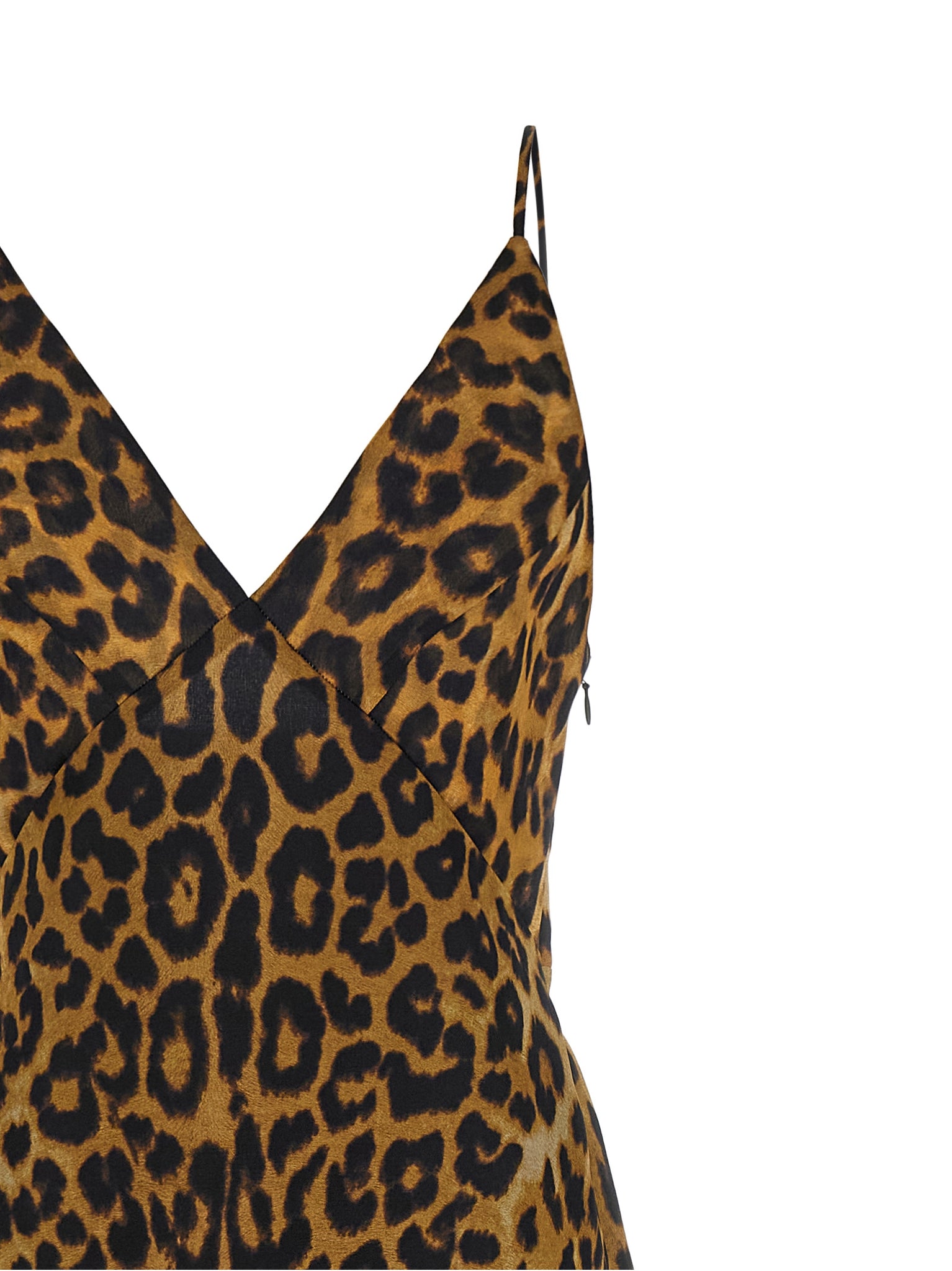 All-over leopard-print silk organza long dress, Wide front v-neck, Hourglass silhouette with wide skirt, Thin straps, Sleeveless, Wide back square neckline, Side zip closure, Lining. Size and Fit - true to size fitMade in: Hungary
