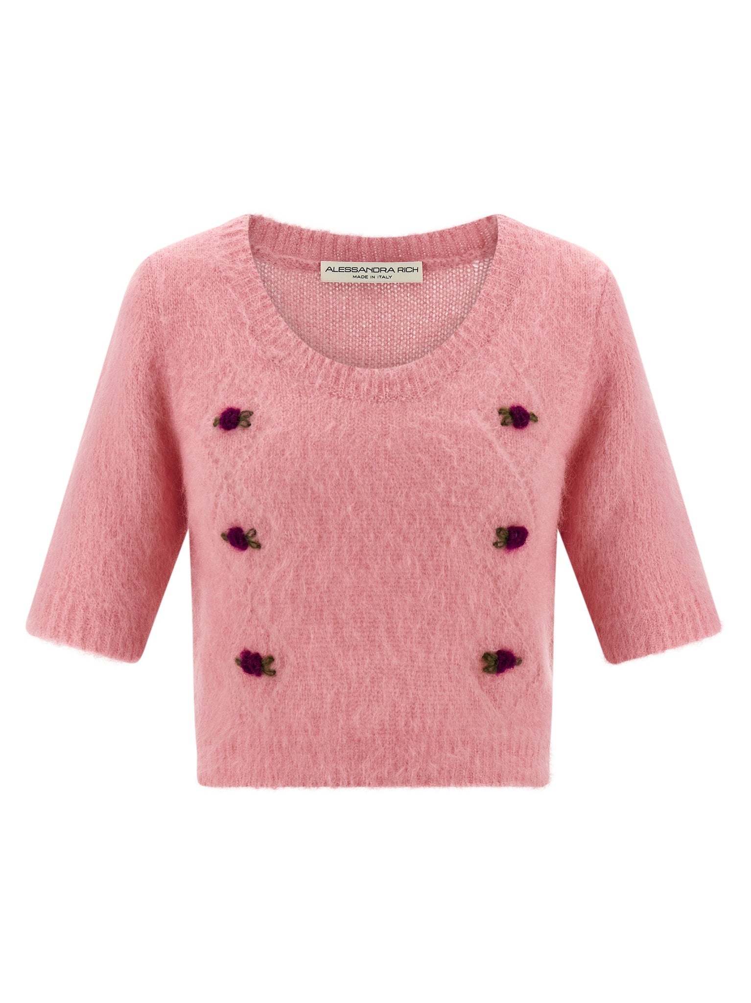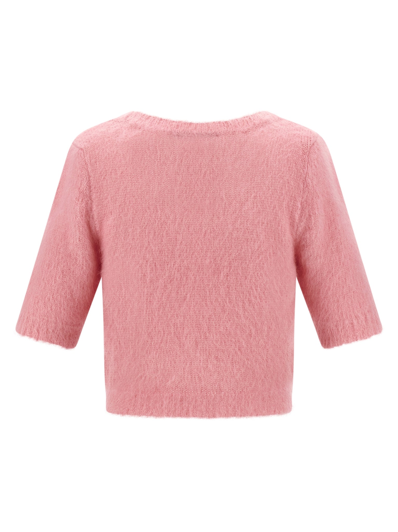 'carded mohair' cardigan in alpaca and wool blend with embroidery and cut-out details, Crop model, Wide round neckline, Short sleeves. Size and Fit - true to size fit