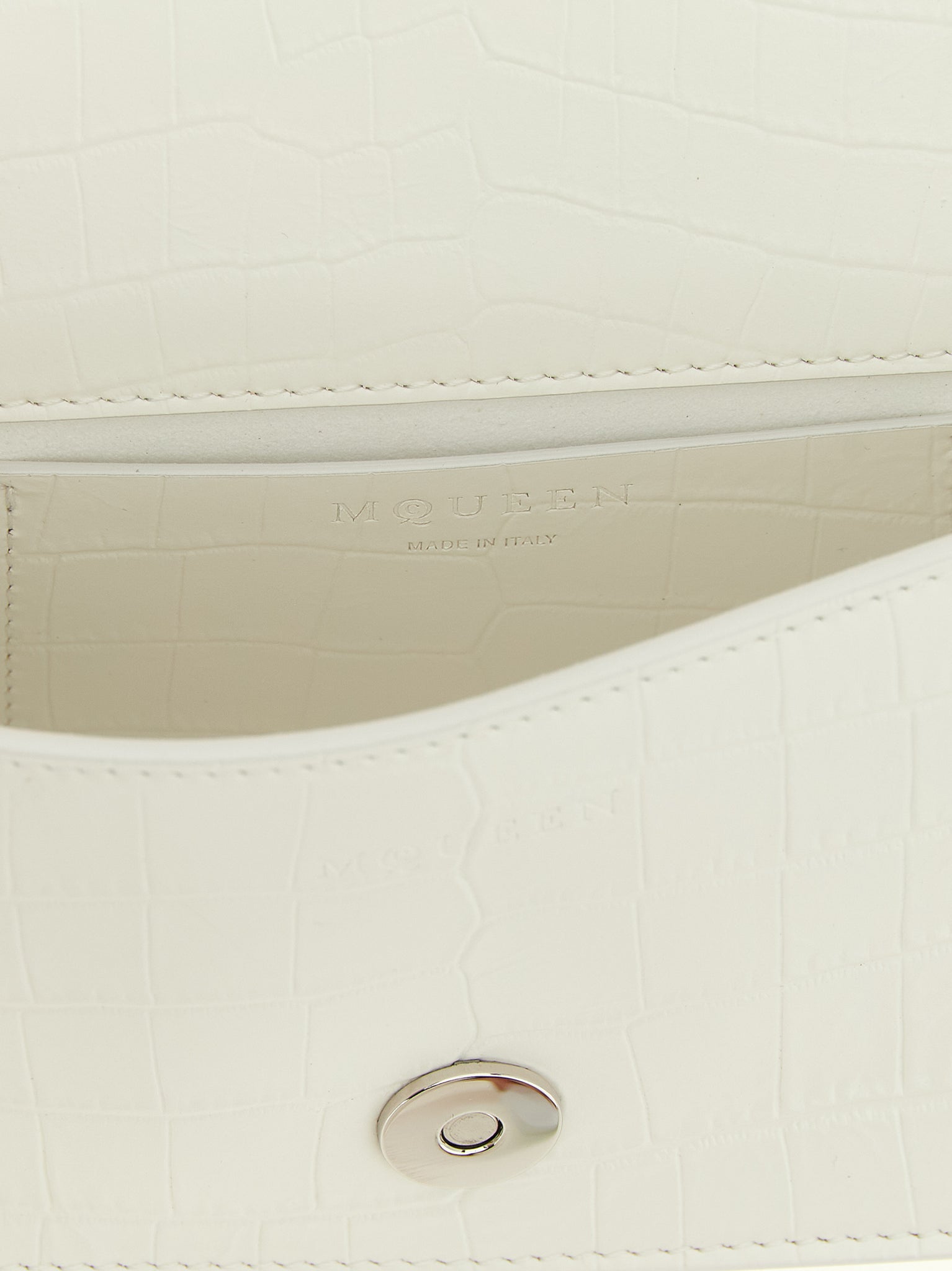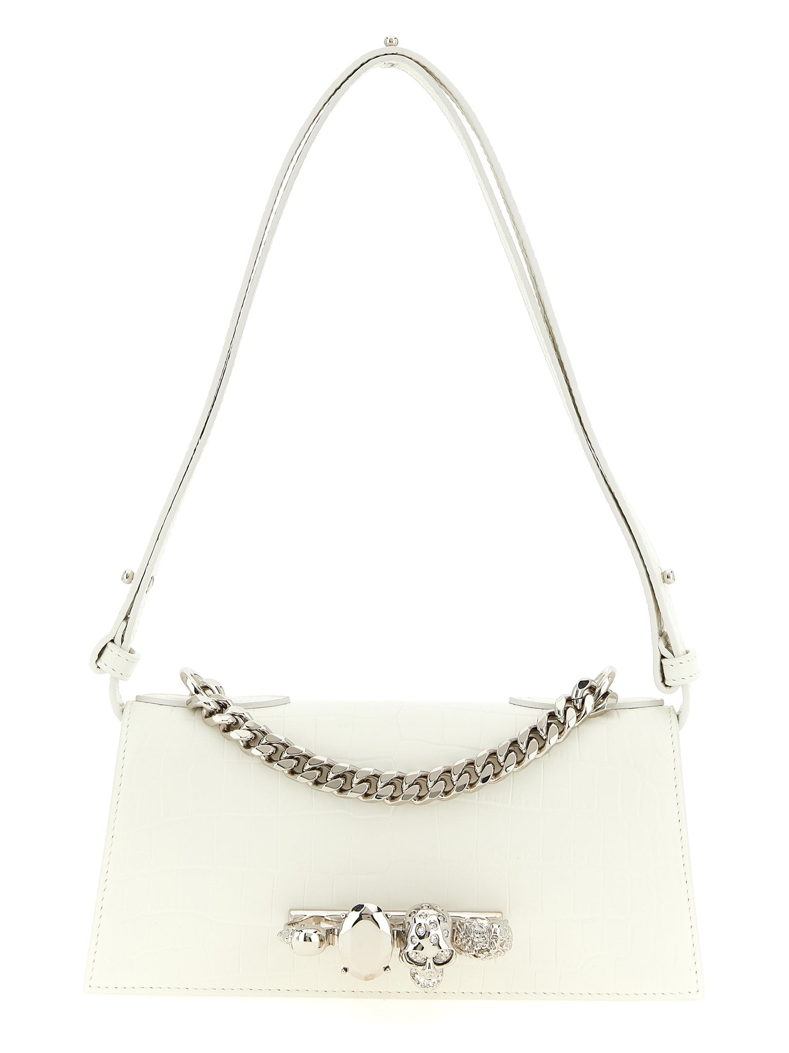 'jewelled' mini shoulder bag in crocodile-effect embossed print calf leather with semi-matte finish, Magnetic flap closure with 'knuckle' metal detail with the iconic 'skull' with crystals, Fixed chain handle, Adjustable and removable shoulder strap. Size and Fit - W 24 x h 11 x d 7 cm