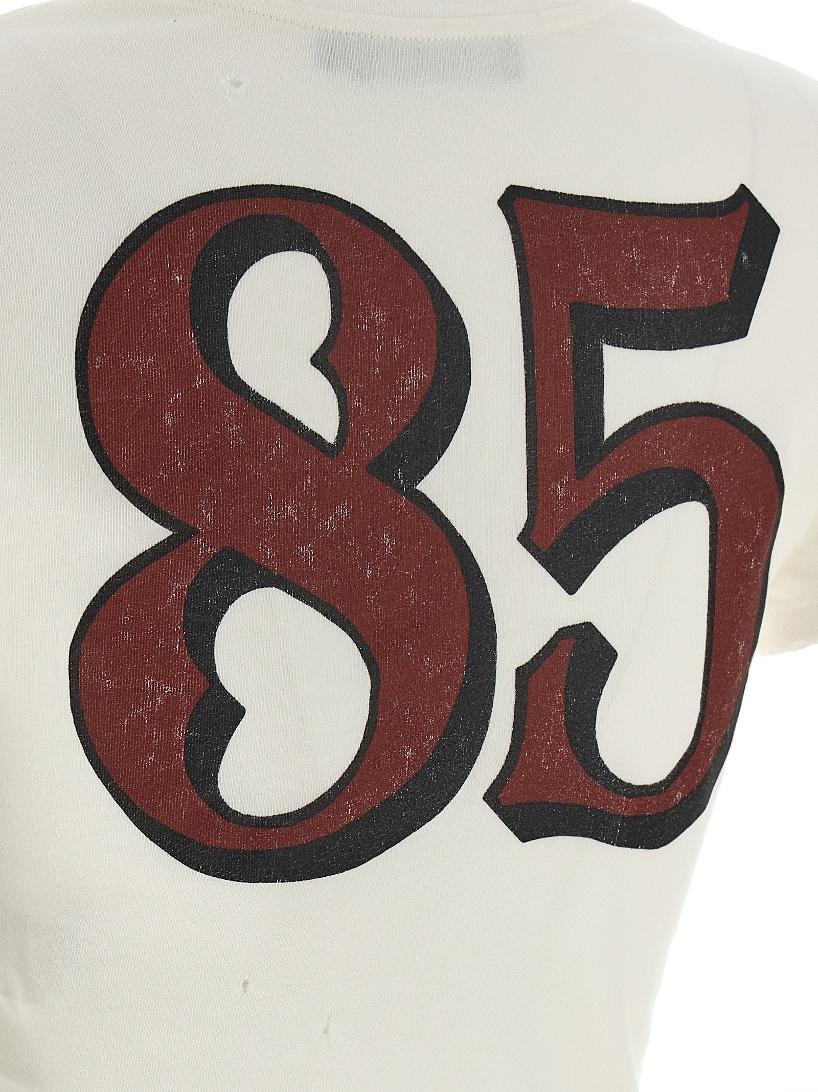 Cotton jersey T-shirt with used effect, crop style, front and back print, pleats under the breast, crew neck, short sleeves. Size and Fit - Slim fit
