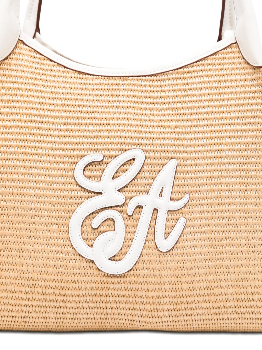 This Emporio Armani medium straw tote in white offers lightweight structure with a roomy interior that fits everyday essentials and a tablet. The woven body keeps the bag breathable and crisp while leather-trimmed handles provide comfortable carry and lasting reinforcement. Ideal for seasonal outings, it pairs easily with casual and resort wardrobes for a refined, effortless look.