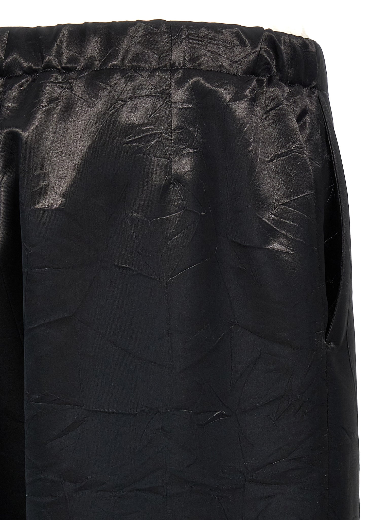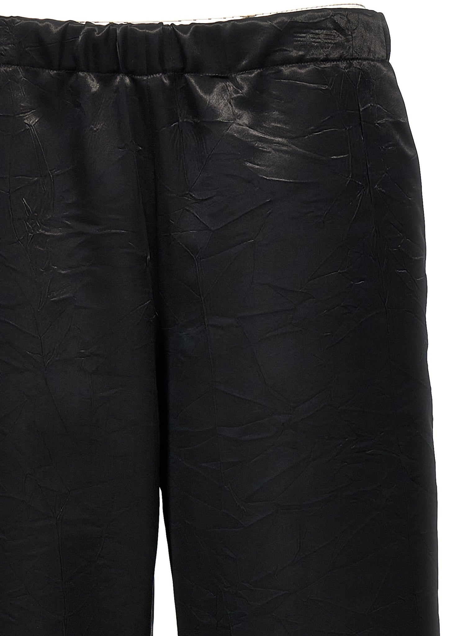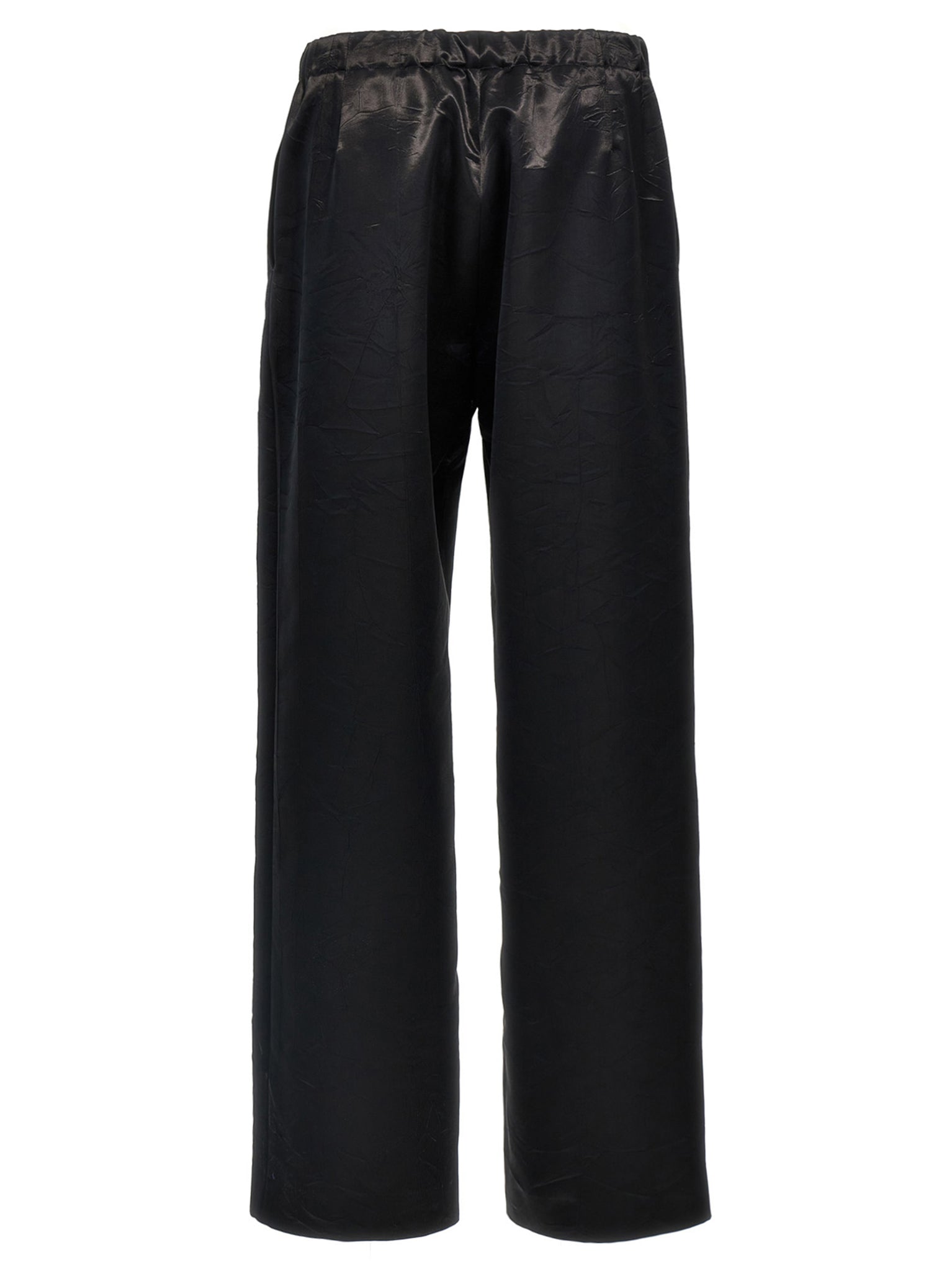 Shiny fabric trousers, regular fit, straight leg, elastic waistband, pockets. Size and Fit - True to size fit