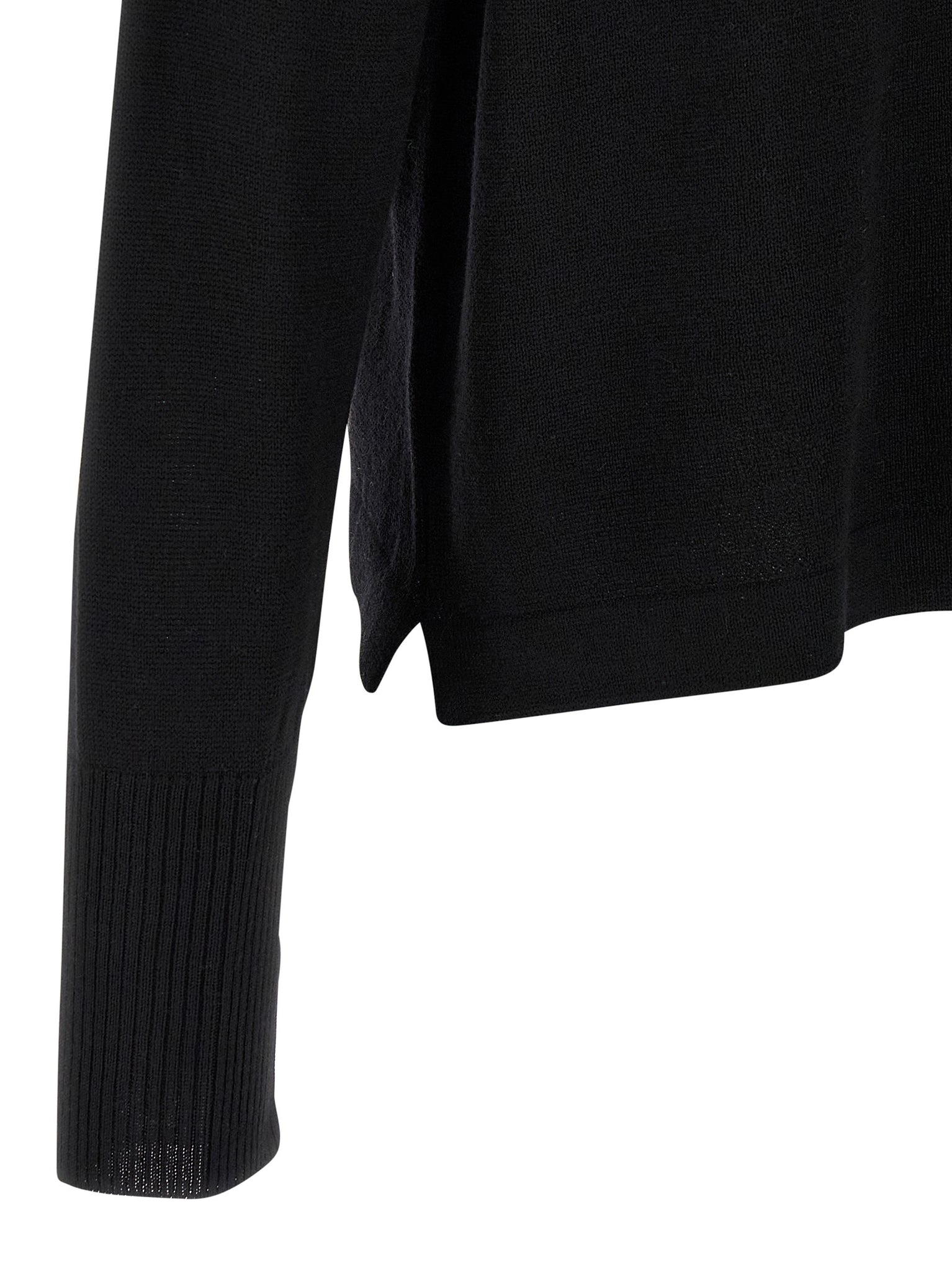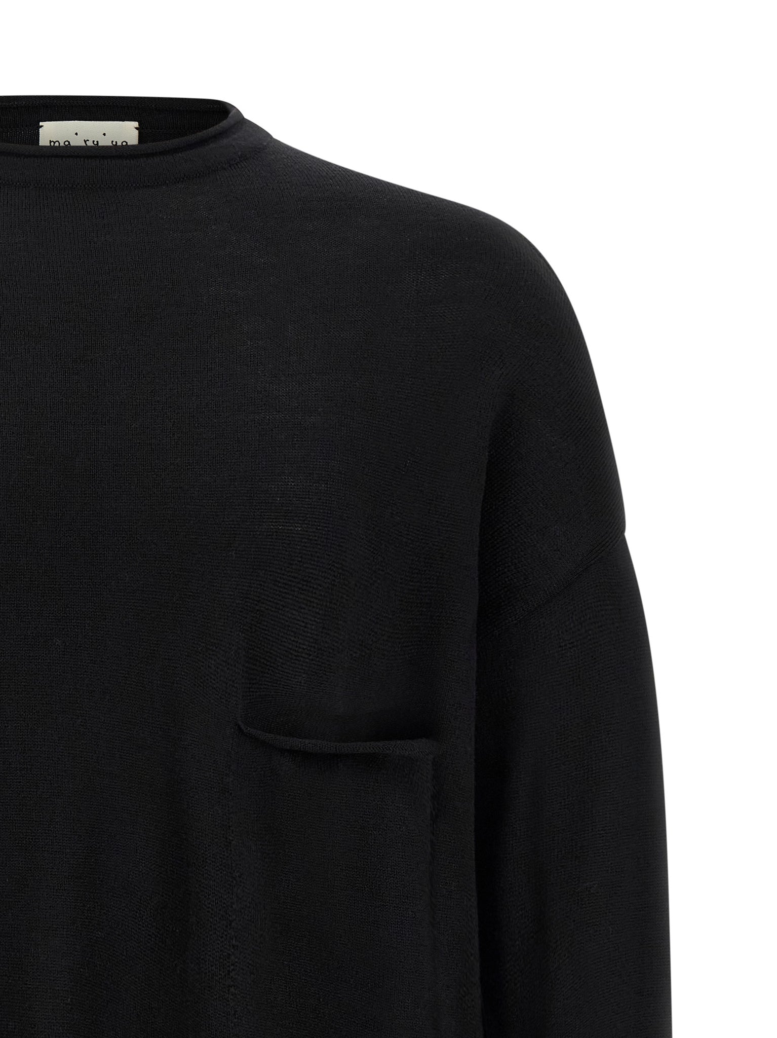 Fine wool sweater with raw cut crew neck, Front pocket, Side slits, Long sleeves with cuffs. Size and Fit - Oversized fit