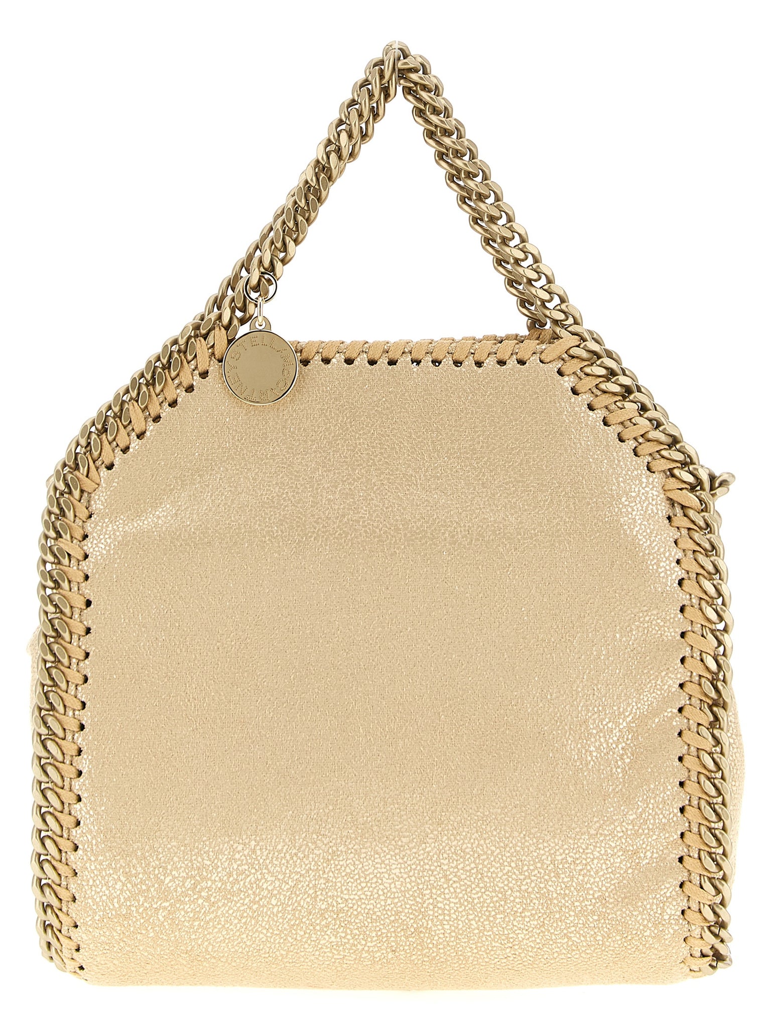 'Falabella Tiny' handbag in 'Eco Shiny Dotted Chamois' fabric with magnetic closure, double handle and long chain shoulder strap with matte effect. Size and Fit - W 18 x H 17.5 x D 6cm