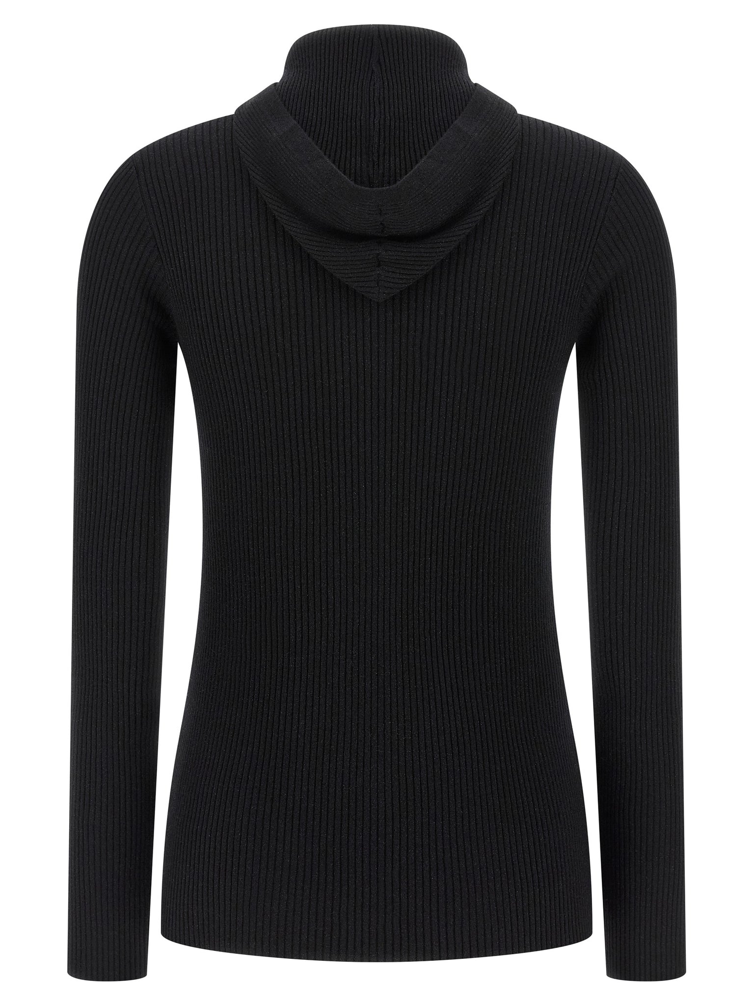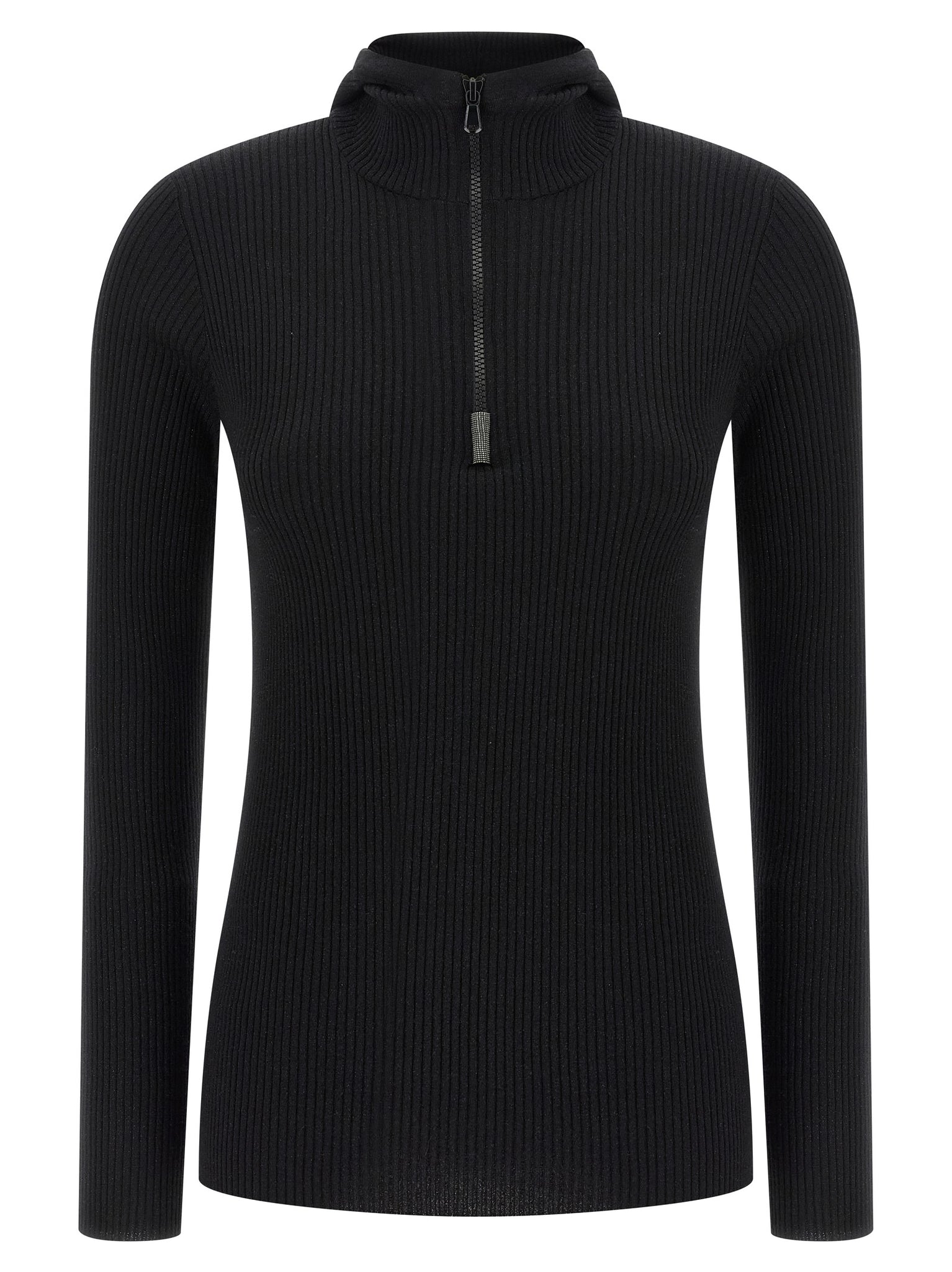 Ribbed cashmere and stretch silk blend hooded sweater with lamé thread, half zip with Monile detail, long sleeves and raw cut hem. Size and Fit - true to size fit