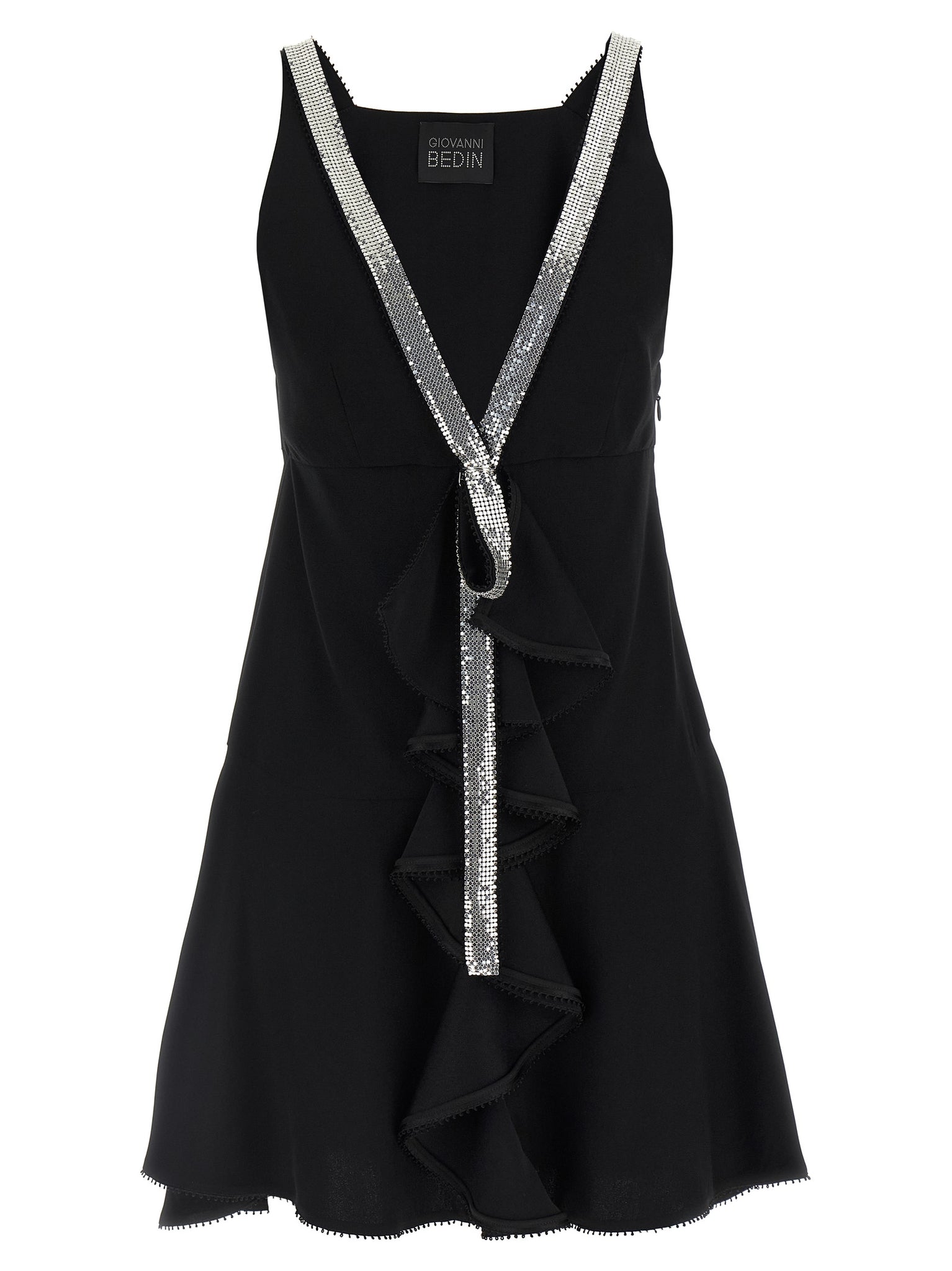 Viscose blend mini dress with micro trimming piping, Sleeveless v-neck with ribbon with all-over flat mini studs, Front crouches, Slits and side zip closure. Size and Fit - true to size fit