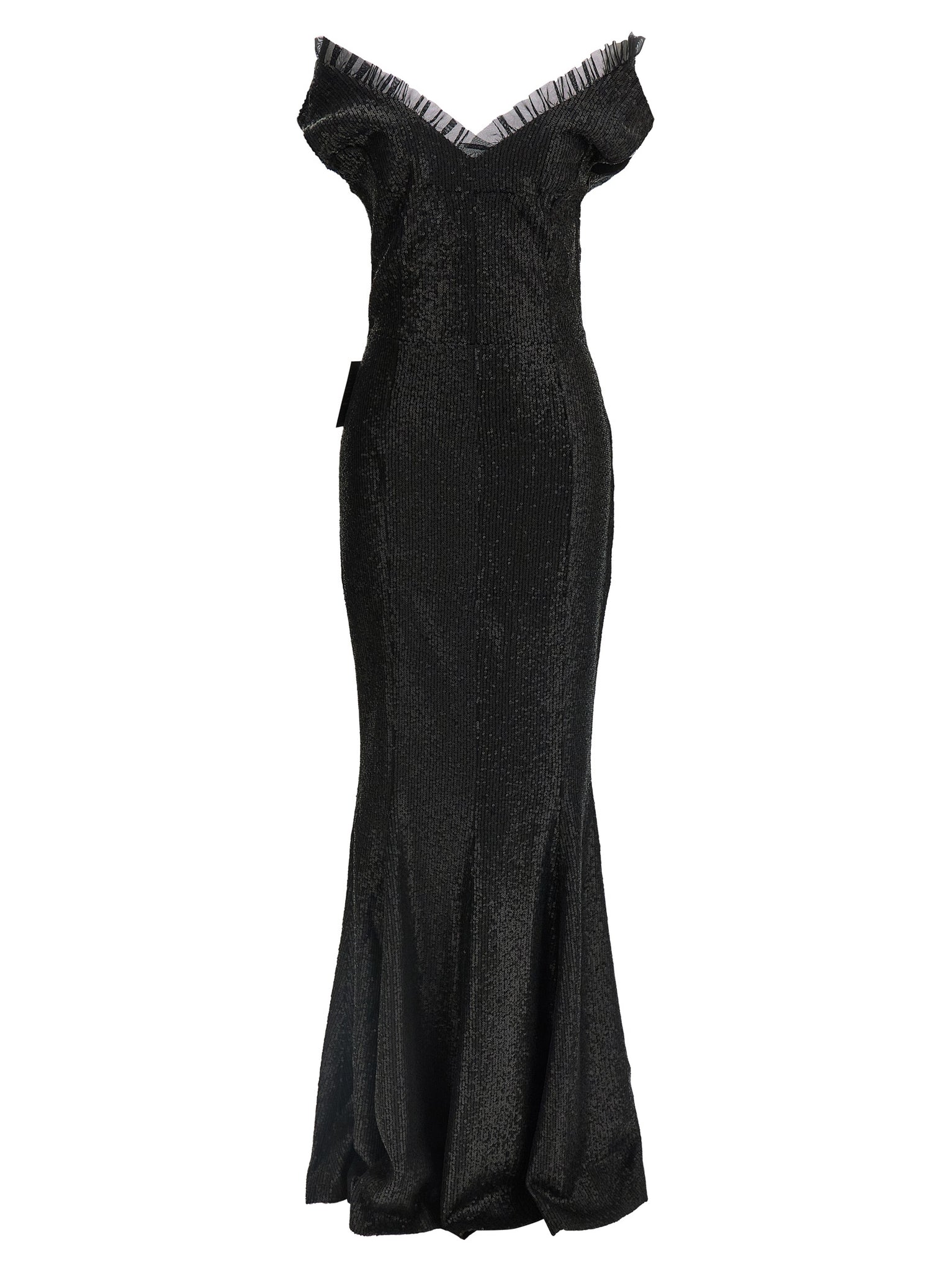 Long 'grace' fabric dress with all-over tone-on-tone sequin appliqué, Off-the-shoulder style with tone-on-tone tulle insert curled on top and dropped shoulder, Sweetheart neckline, Side zip closure, Mermaid silhouette skirt. Size and Fit - true to size fit