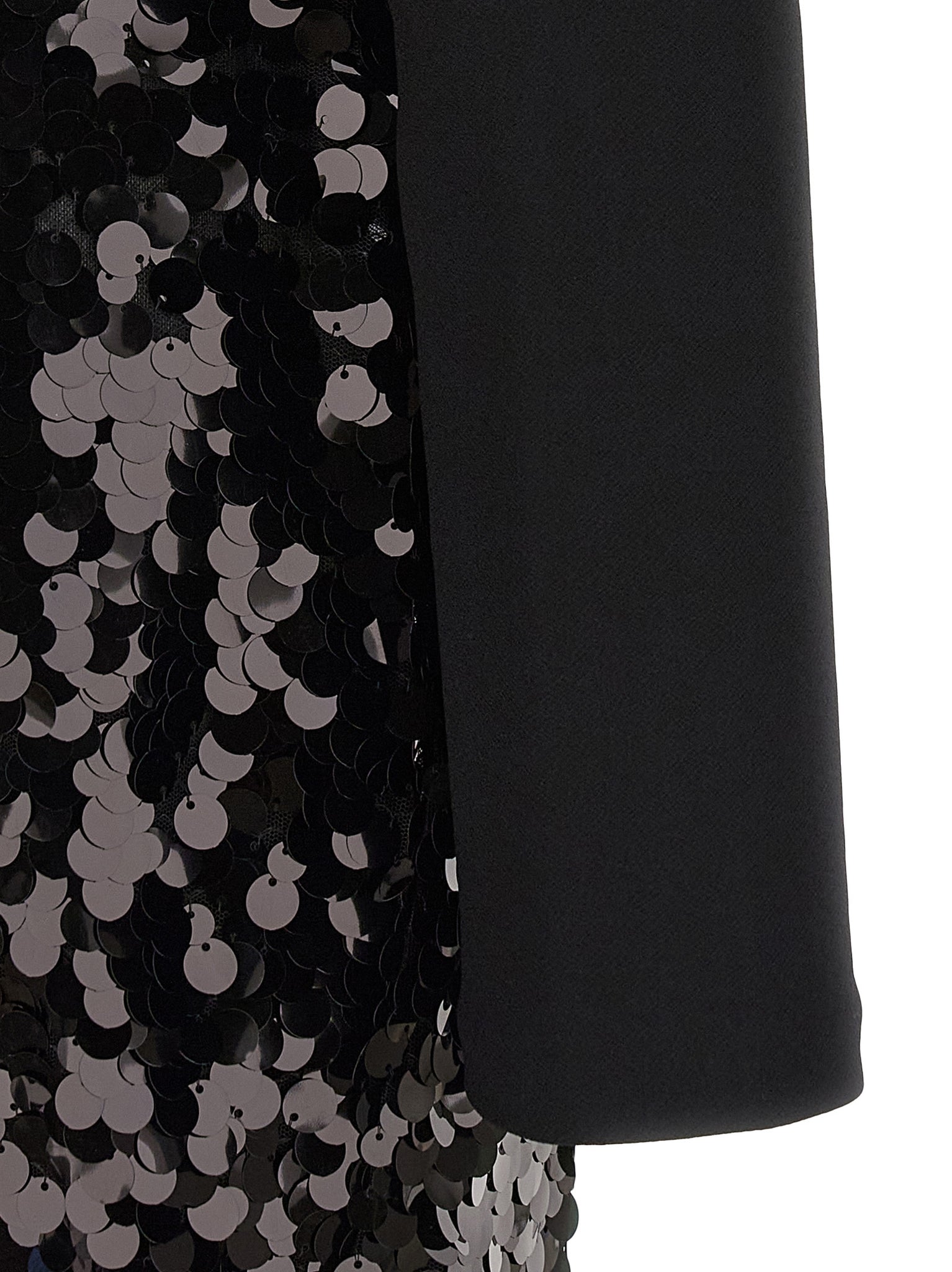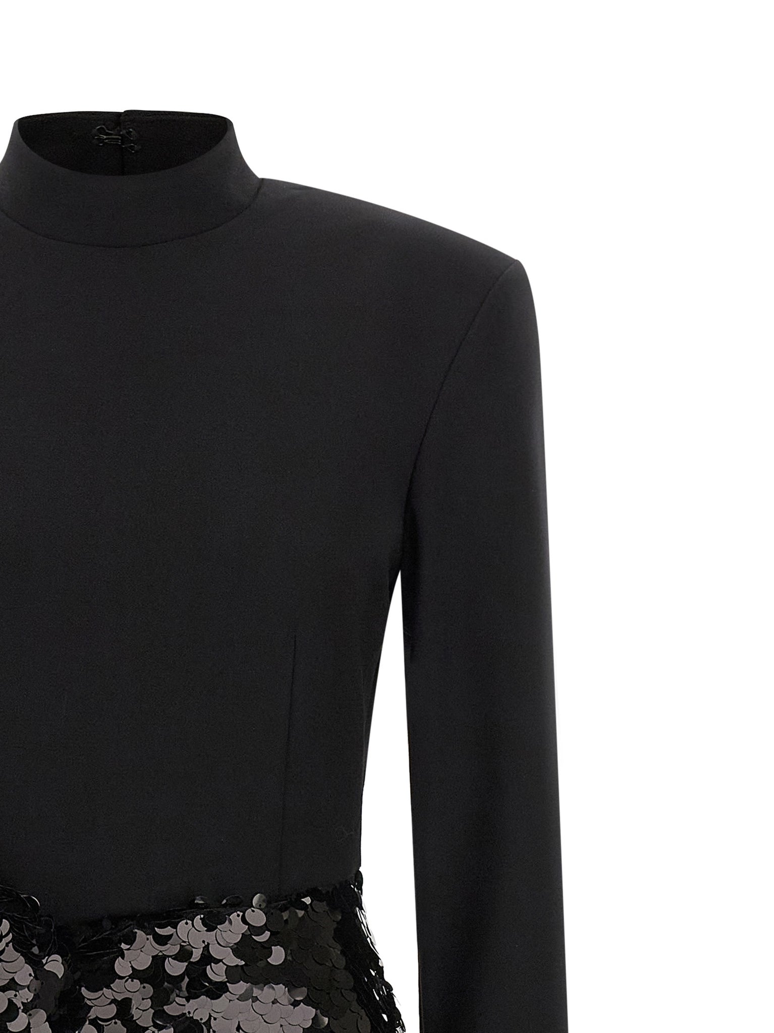 'knotted midi' dress consisting of jersey top, High neck with back hook closure, Long sleeves, Padded shoulder strap, Back zip closure and fabric skirt with all-over sequin application, Front knot detail from which opens a maxi slit with draping, Lining. Sustainable: product made from recycled polyester. Size and Fit - slim fit - GERMAN size