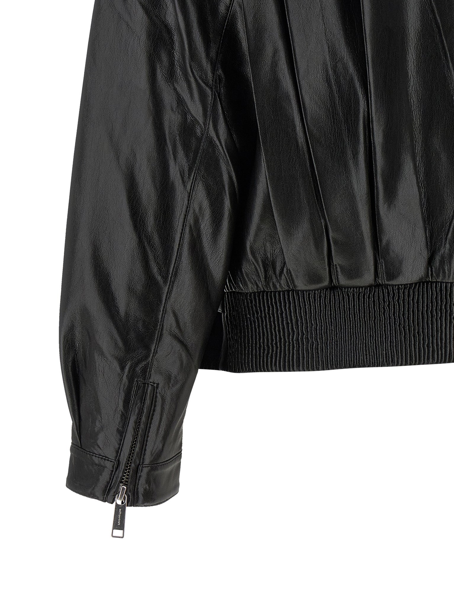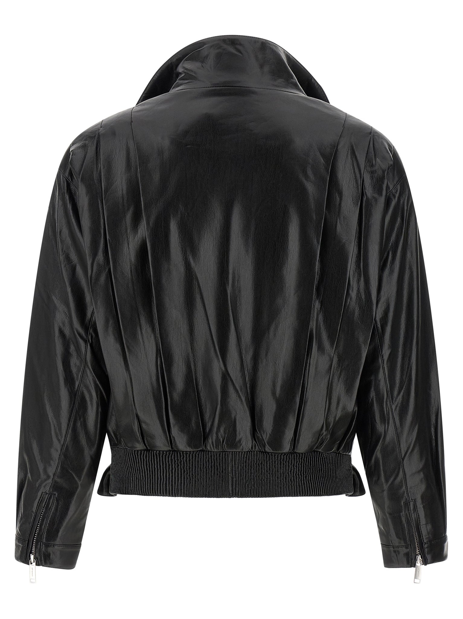 Biker jacket in shiny leather-effect fabric with pleats and pleats on the front and back, Fold-up standing collar, Asymmetric front zip closure, Pockets, Long cuffed sleeves, Zip on the cuffs and dropped shoulders, Back elastic band and adjustable front belt on the hem. Size and Fit - relaxed fit - UK sizing