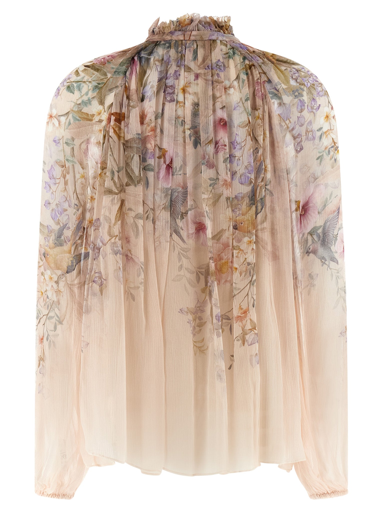 'billow rebellion' blouse in 'aviary' patterned curled viscose, Raised collar with ruffles, V-neck with tie cord, Long puff sleeves with elastic cuffs, Removable top. Twisted romance collection. Size and Fit - Relaxed fit