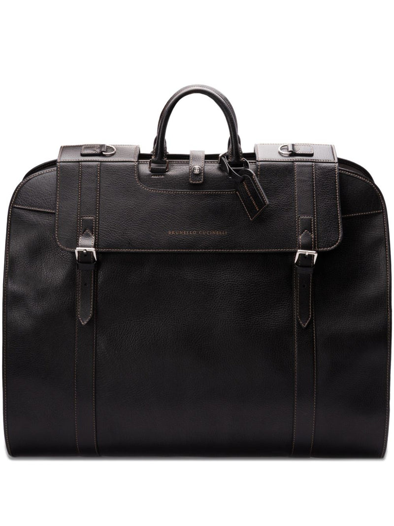 Discover a refined leather travel suit cover from Brunello Cucinelli in black that protects garments during transit while maintaining a polished profile. Designed for the modern traveler, it features dual top handles, a front flap with press-stud fastening, silver-tone hardware, an exterior pocket and an interior compartment for organized storage. The thoughtful construction preserves suit shape and minimizes creasing, helping you arrive ready to wear.