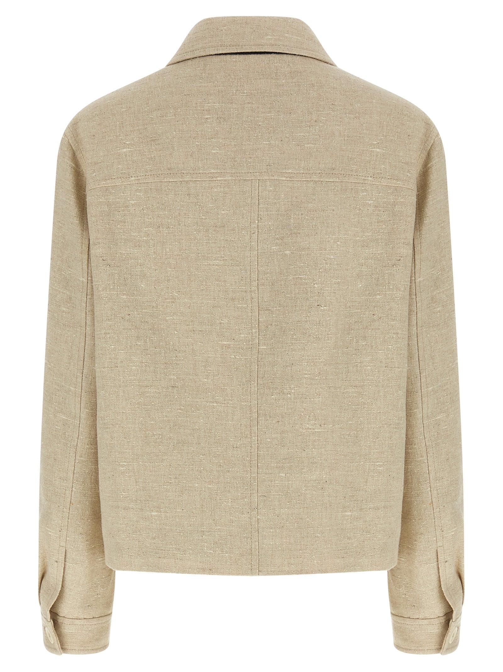 Double-breasted jacket in linen and silk blend, Natural fabric with slightly irregular weave, Short style with silk lining, Pointed collar, Front closure with maxi contrasting buttons, Vertical front pockets, Long sleeves with cuffs and buttons. Size and Fit - True to size fit