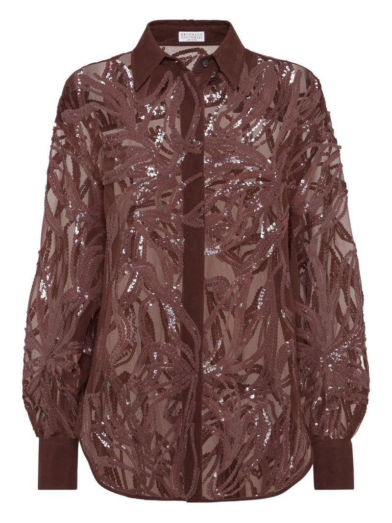 brown silk sequin embellishment floral pattern long sleeves button fastening Silk shirtMade in: Italy