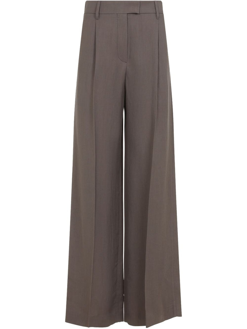 Discover refined comfort with Brunello Cucinelli trousers in brown linen that combine a soft, roomy silhouette with subtle shiny details for a polished daytime look. These adult female trousers feature a concealed front button with hook-and-zip fastening, belt loops, two side slit pockets and two rear welt pockets for practical wear. The design balances breathable linen and a tailored finish so you can move easily while maintaining an elegant profile.