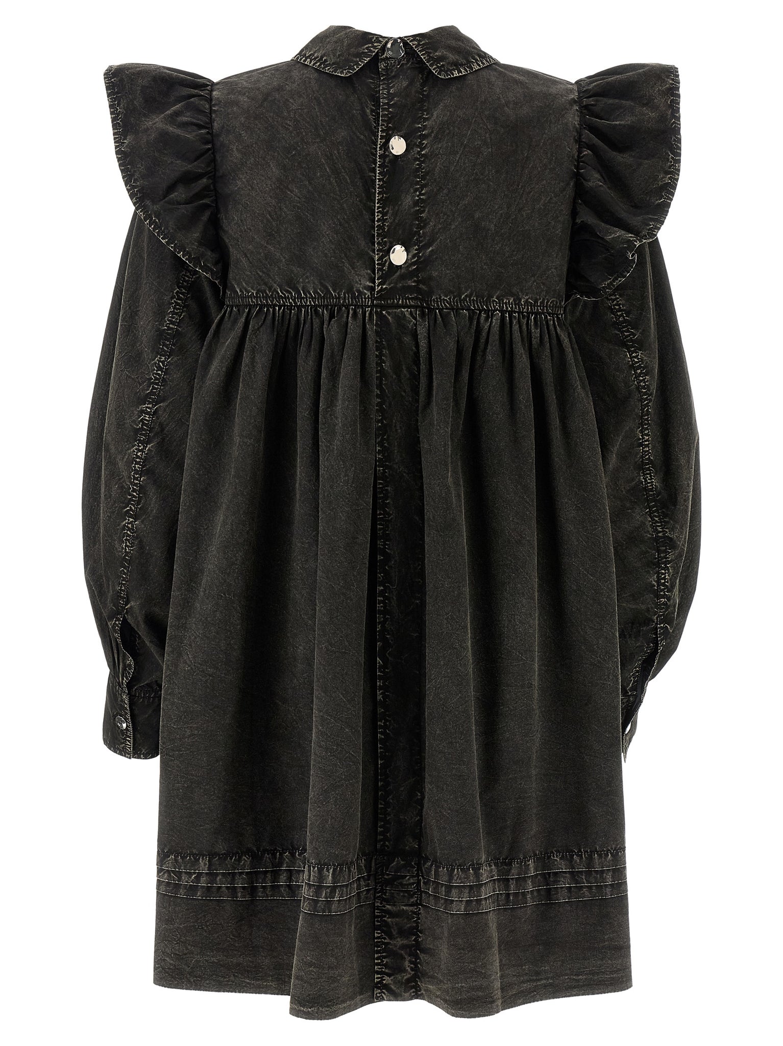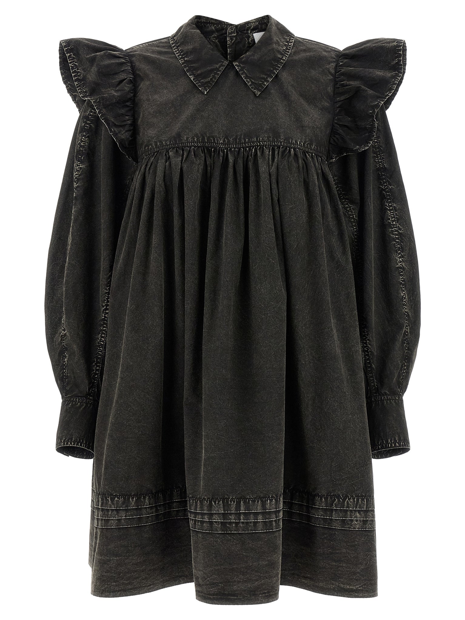 'black washed mini shirt' cotton dress with délavé effect garment, Shirt model with curls and mini flounces front and back, Long wide sleeves with cuffs and maxi ruffles on the shoulder, Back button closure, Pockets, Unlined. Sustainable: this product is made of organic cotton. Size and Fit - relaxed fit - EU size