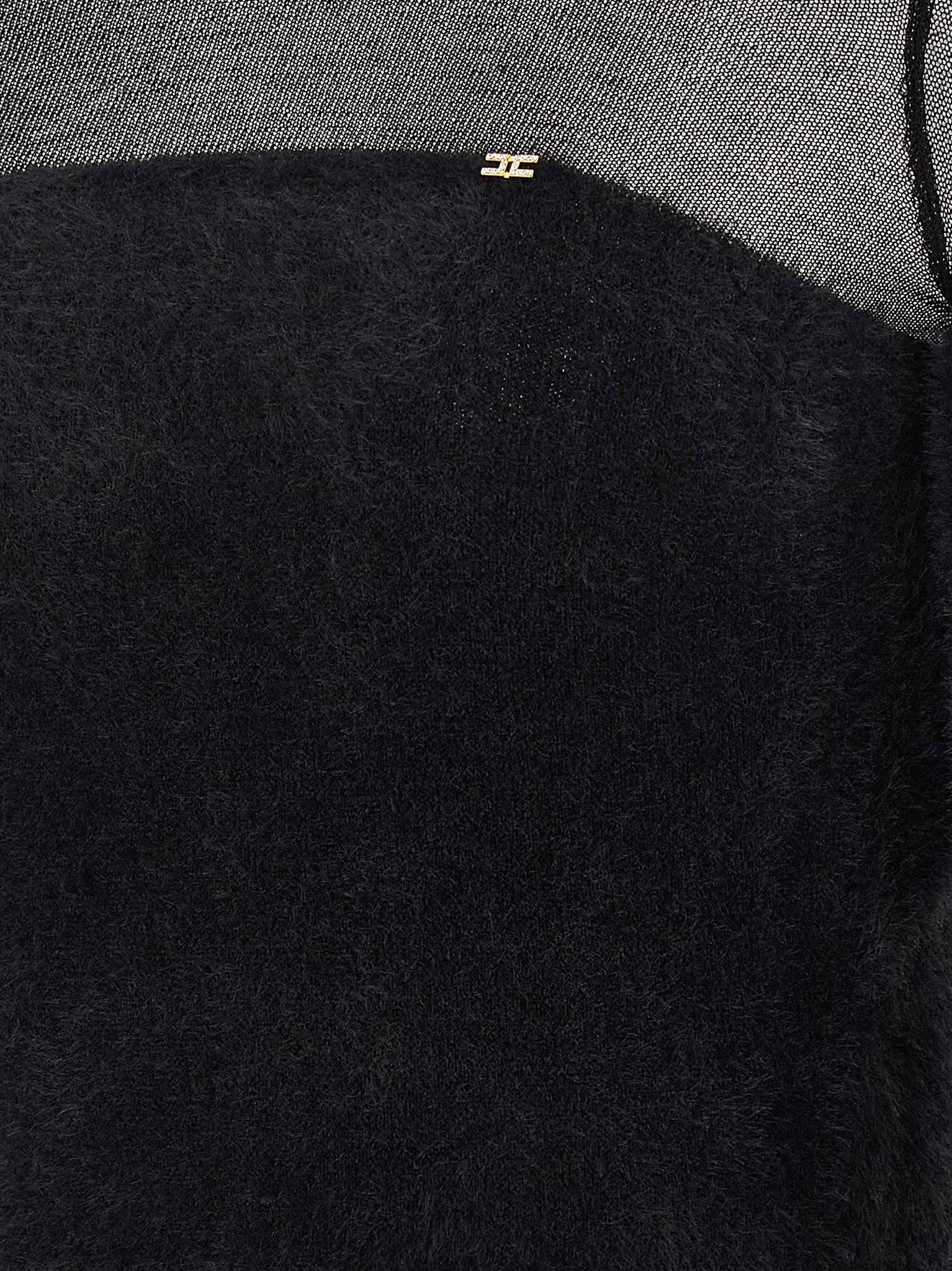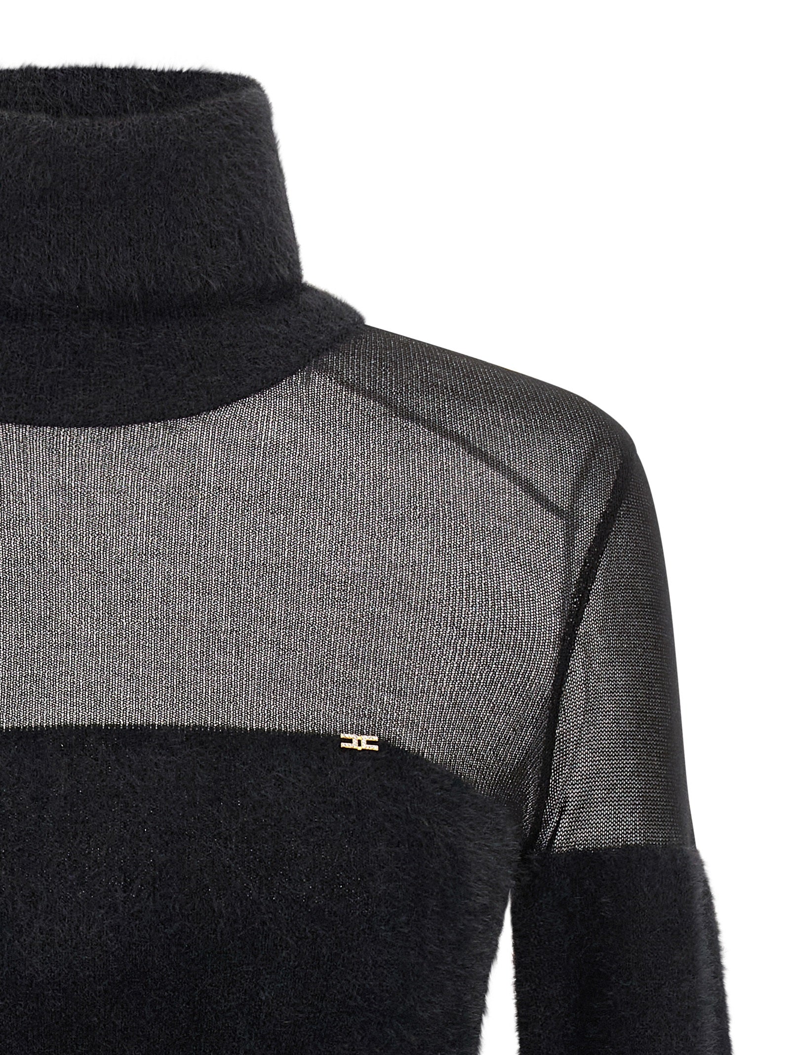 Fur-effect knitted turtleneck sweater with semi-transparent gauze insert on the shoulders, front jewel metal logo, crop model, turned-up high neck, long cuffed sleeves. Size and Fit - Slim fit