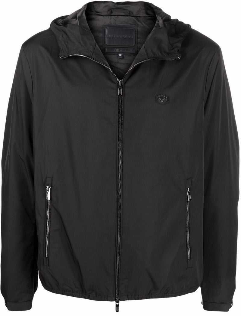 Refined and versatile, this Emporio Armani coat in black features a classic hood, front zip fastening and two side slit pockets for practical everyday wear. A front logo patch and clean lines deliver a modern, streamlined look that layers easily over shirts and light knitwear. The piece fits true to size; the model is 1.84 m (6 ft 1 in) wearing size 48 (IT).