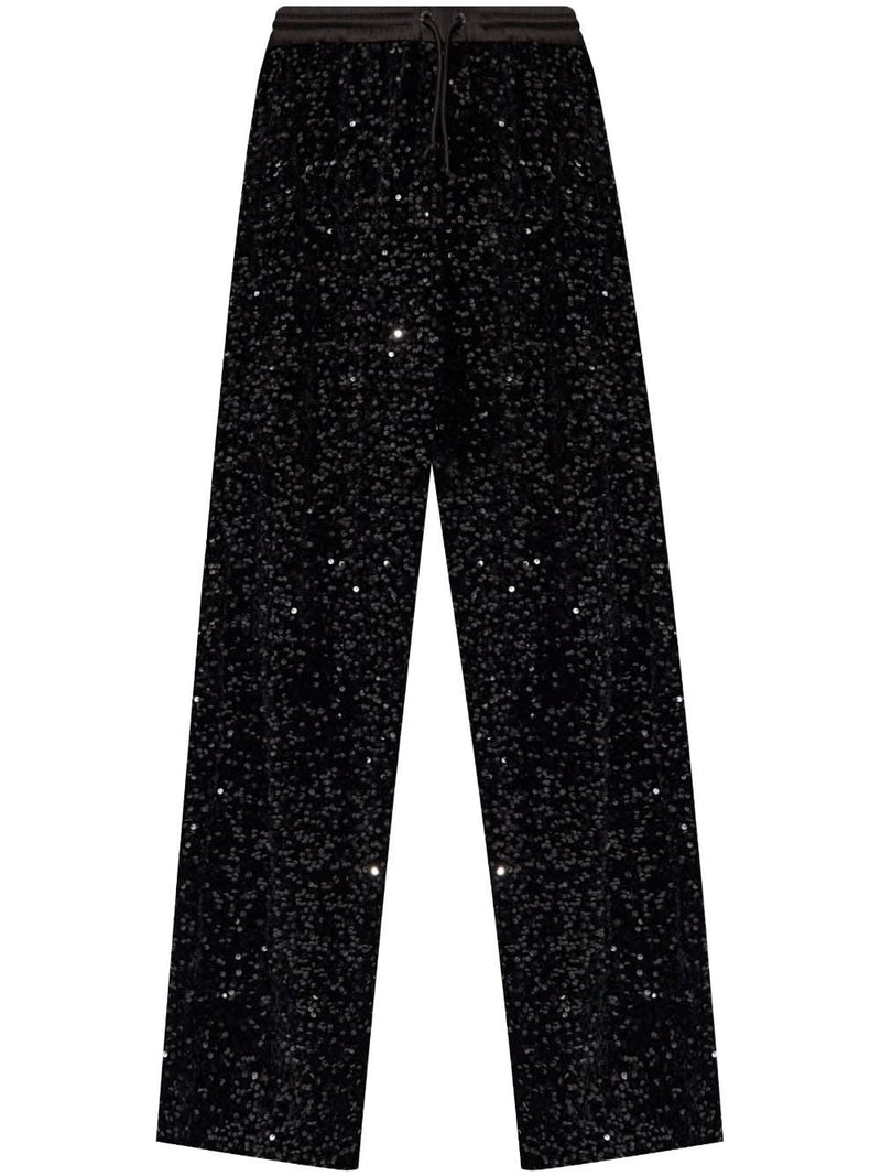 black high-shine finish elasticated drawstring waistband high-waisted lurex detailing sequin embellishment slip pockets to the sides straight leg Size and Fit - This piece fits true to size. We recommend you get your regular size. Model is 1,75m / 5ft 8in wearing size SMade in: China