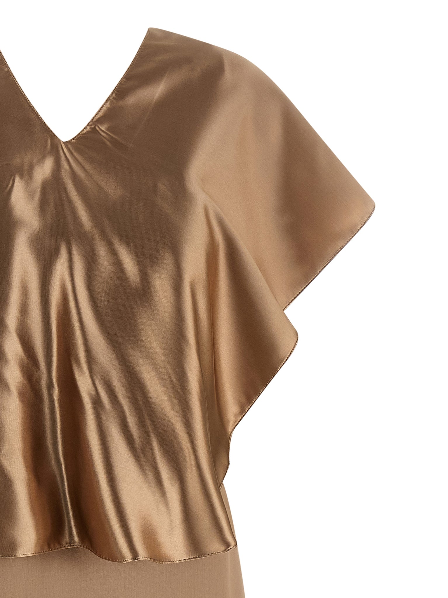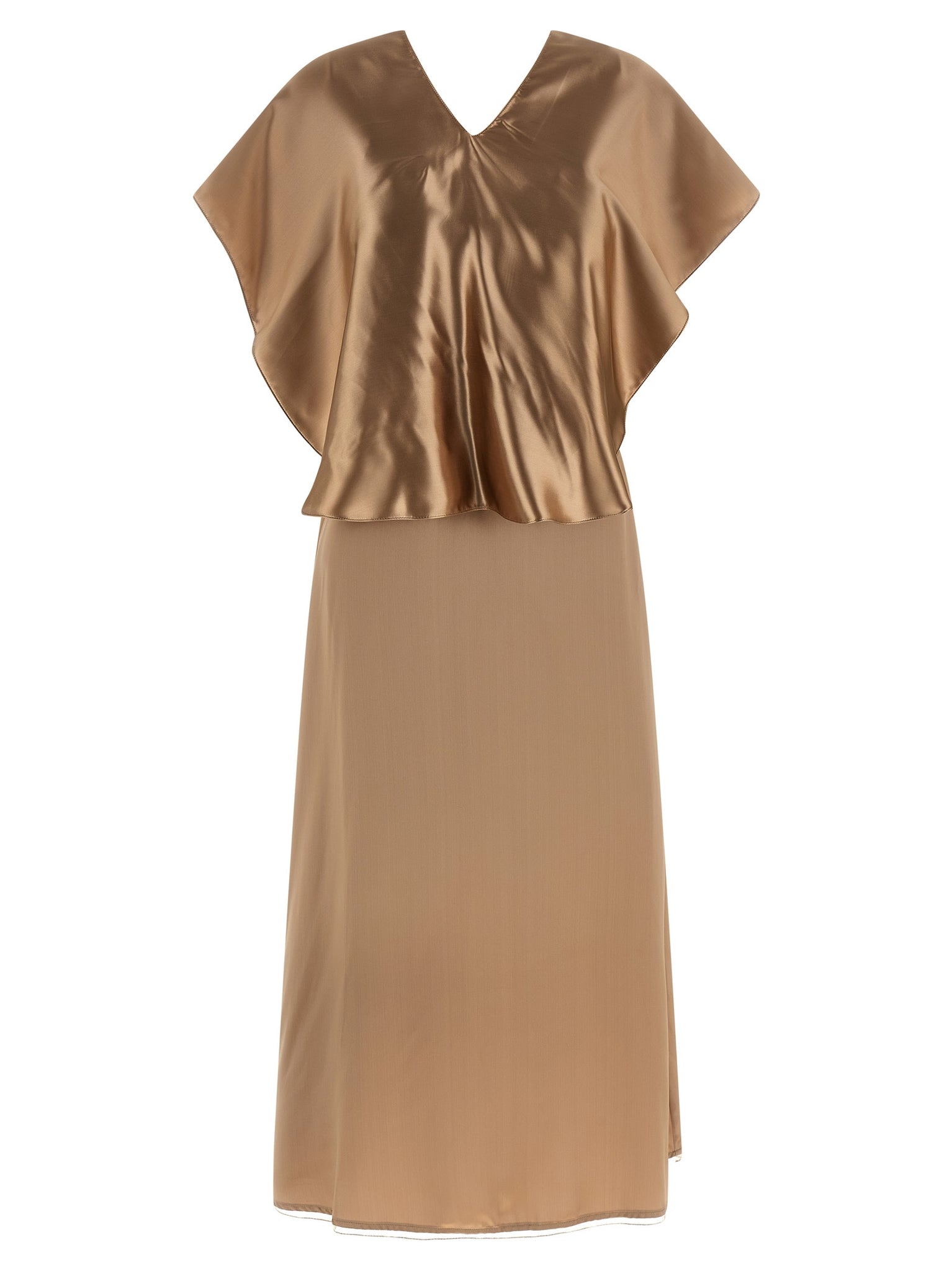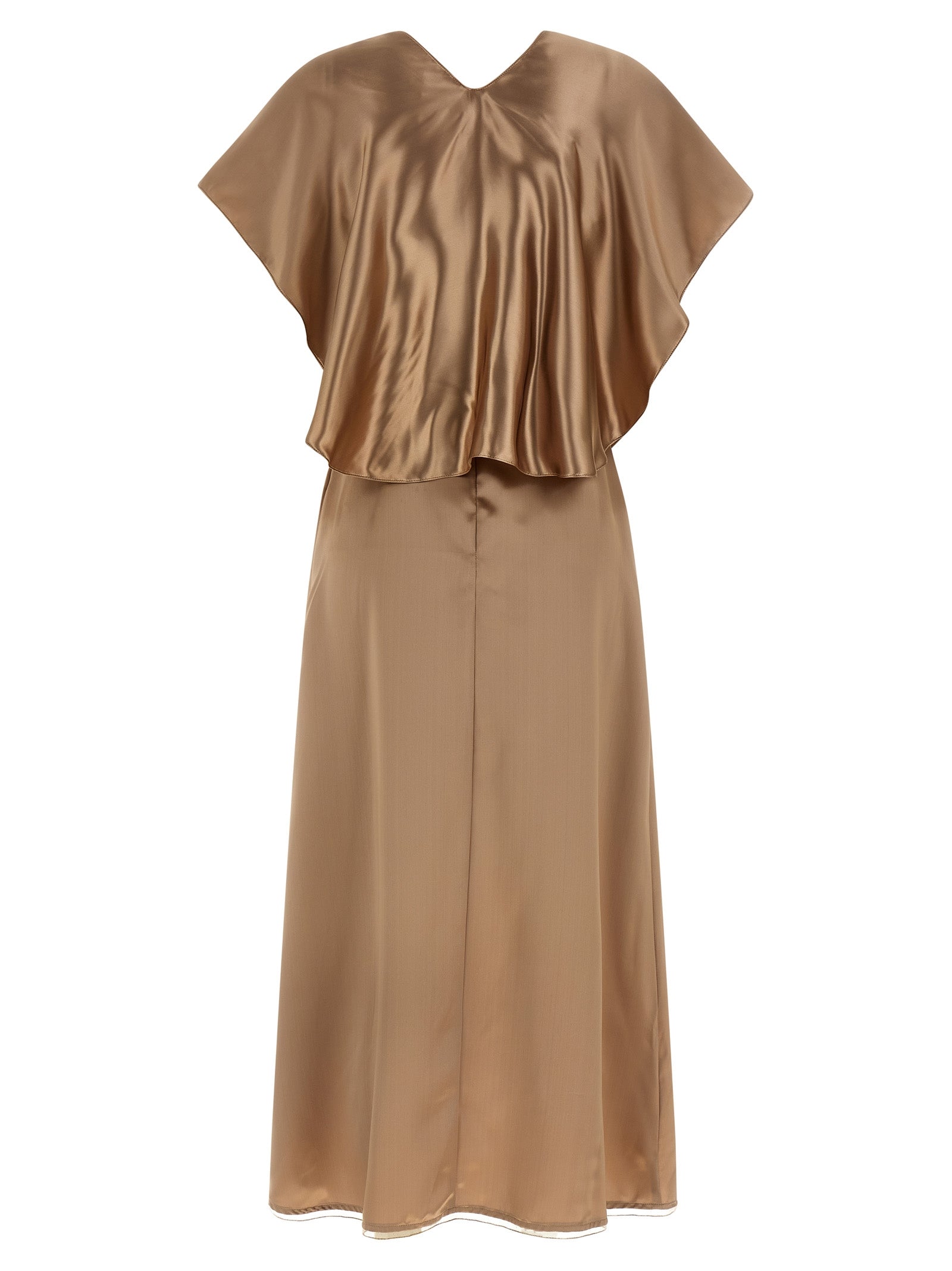 Liquid satin midi dress with lingerie, sweetheart neckline, thin straps, hourglass silhouette, back zip closure, matching cape with boat neckline and removable 3/4 wide sleeves. Size and Fit - true to size fit
