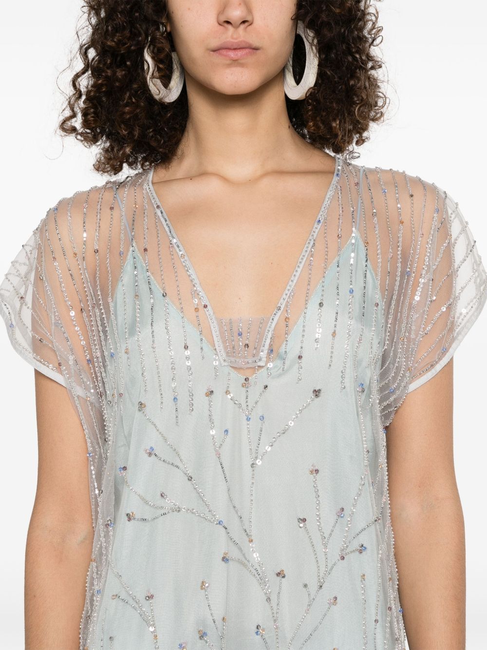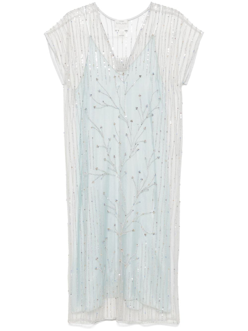 This clear blue Forte Forte embroidered tulle long dress features a white internal slip, bead embellishment and a subtle horizontal stripe pattern for refined movement. The V scollo and c/sottoveste construction balance coverage with an airy silhouette that flatters at full length. It fits true to size; the model is 1.75m (5ft 8in) wearing size 1. Designed for adult women seeking elegant evening wear with a hint of disco-inspired sparkle.