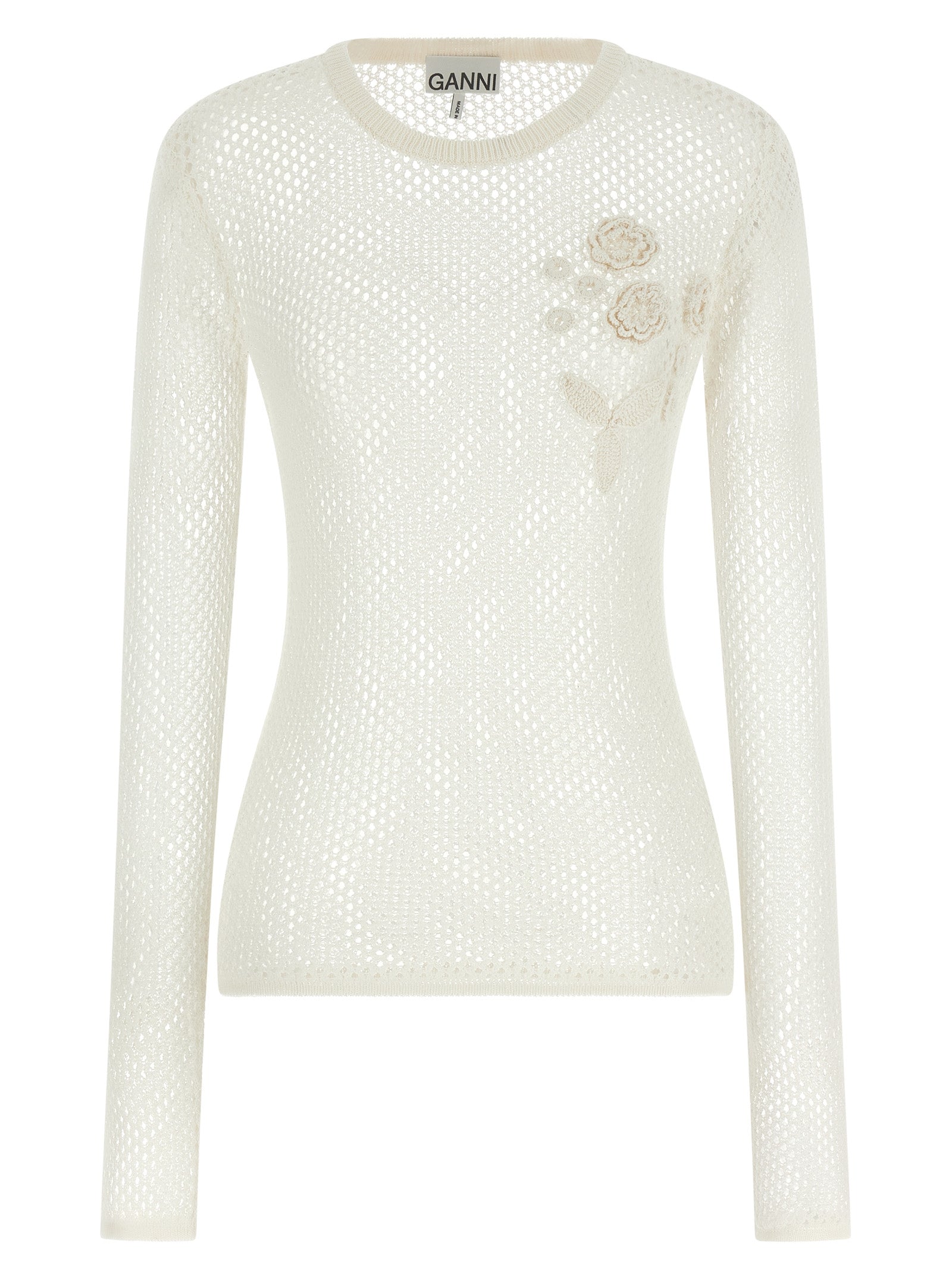 Cotton mesh pointelle sweater with front floral 3d applications, Round neckline, Long sleeves. Sustainable: this product is made of organic cotton. Size and Fit - true to size fit
