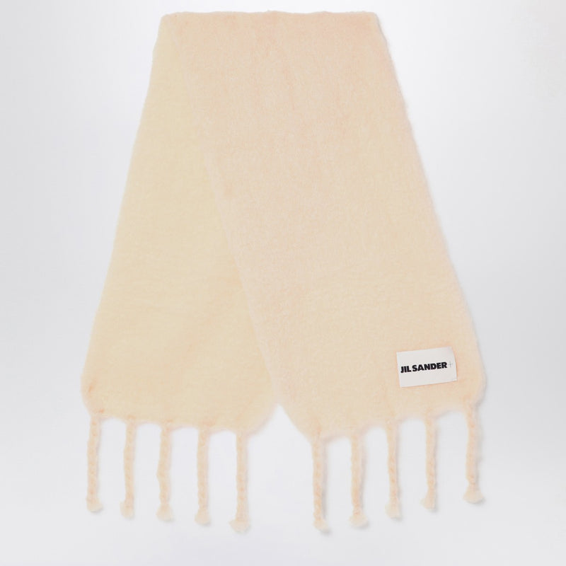 Pale pink mohair and wool blend scarf by Jil Sander, featuring fringes at the ends and logo patch on the hem.Made in: Spain