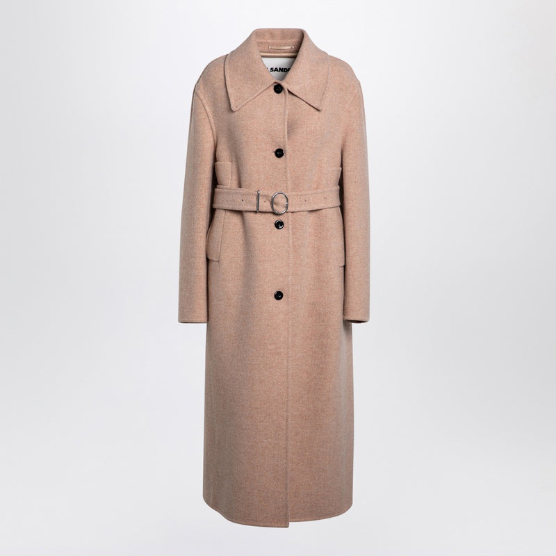 Pink granite virgin wool single-breasted coat from Jil Sander featuring long sleeves, a wide pointed collar, a front button placket, an adjustable and removable waistband, two side welt pockets and a back vent. Size and Fit - Model wears size 36 FR Model measurements: Height: 179 cm Chest: 82 cm Waist: 65 cm Hips: 90 cmMade in: Italy