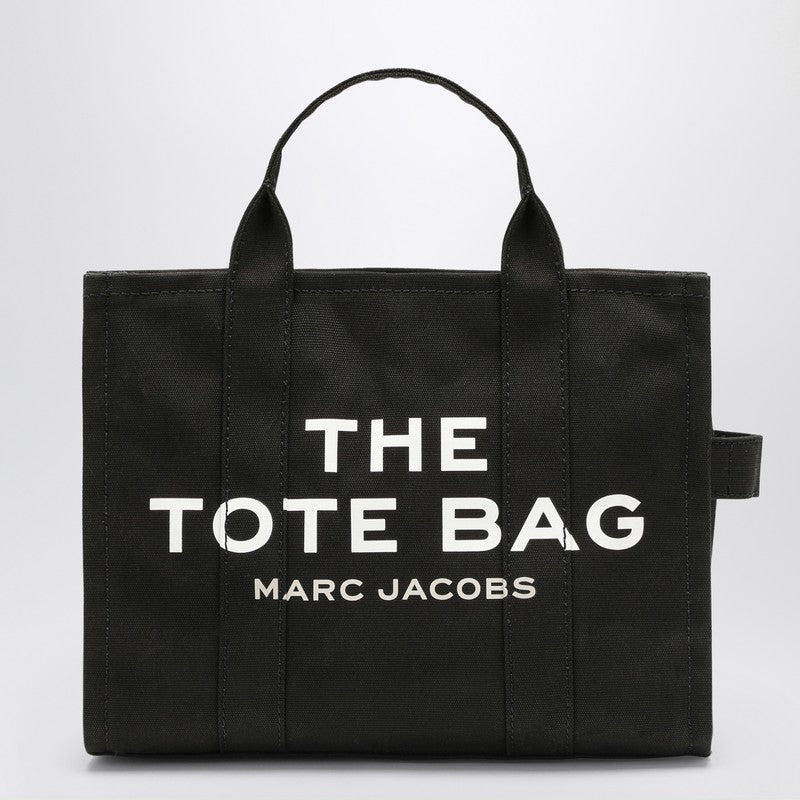 Medium tote bag by Marc Jacobs in black cotton canvas, featuring two top handles, zip closure, two internal slip pockets, contrasting front logo lettering and logo patch on the back. Size and Fit - Larghezza 34 cm x Altezza 27 cm x Profondità 15 cm Lunghezza tracolla regolabile min 95 cm - max 138 cm Luce manico: 12 cm