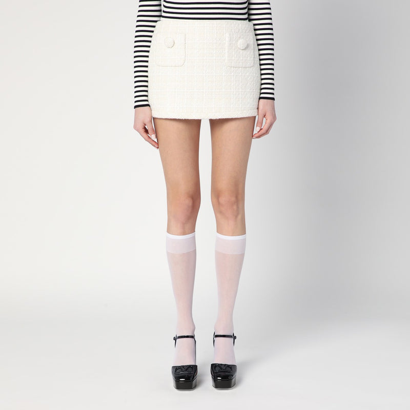 Ivory textured tweed mini skirt by Marc Jacobs, featuring two front patch pockets with button and side zip closure. Size and Fit - Model wears size S Model measurements: Height: 179 cm Chest: 82 cm Waist: 65 cm Hips: 90 cmMade in: China