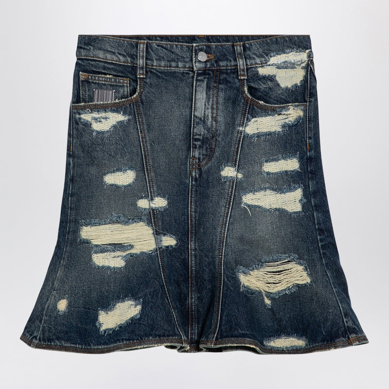 This washed-out cotton denim skirt from Marc Jacobs balances lived-in character with everyday wearability, offering ripped and worn detailing that modernizes classic five-pocket styling. A front zip and button fastening plus waist loops ensure secure fit and easy dressing, while the tailored silhouette pairs well with casual tees or dressier tops for versatile looks. Designed for adult women in a blue wash, the skirt combines durability with a fashion-forward aesthetic suitable for day-to-night wear.