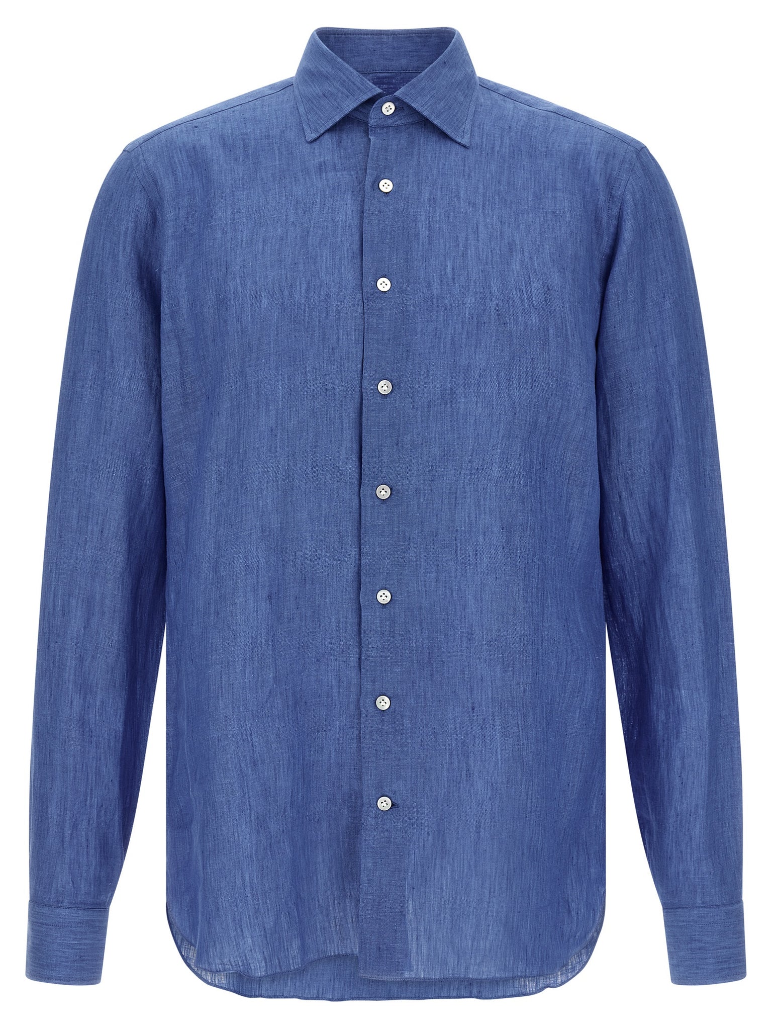 Hand-stitched light linen shirt, Nigel collar, Front mother-of-pearl button closure, Long cuffed sleeves, Rounded hem.Made in: Italy