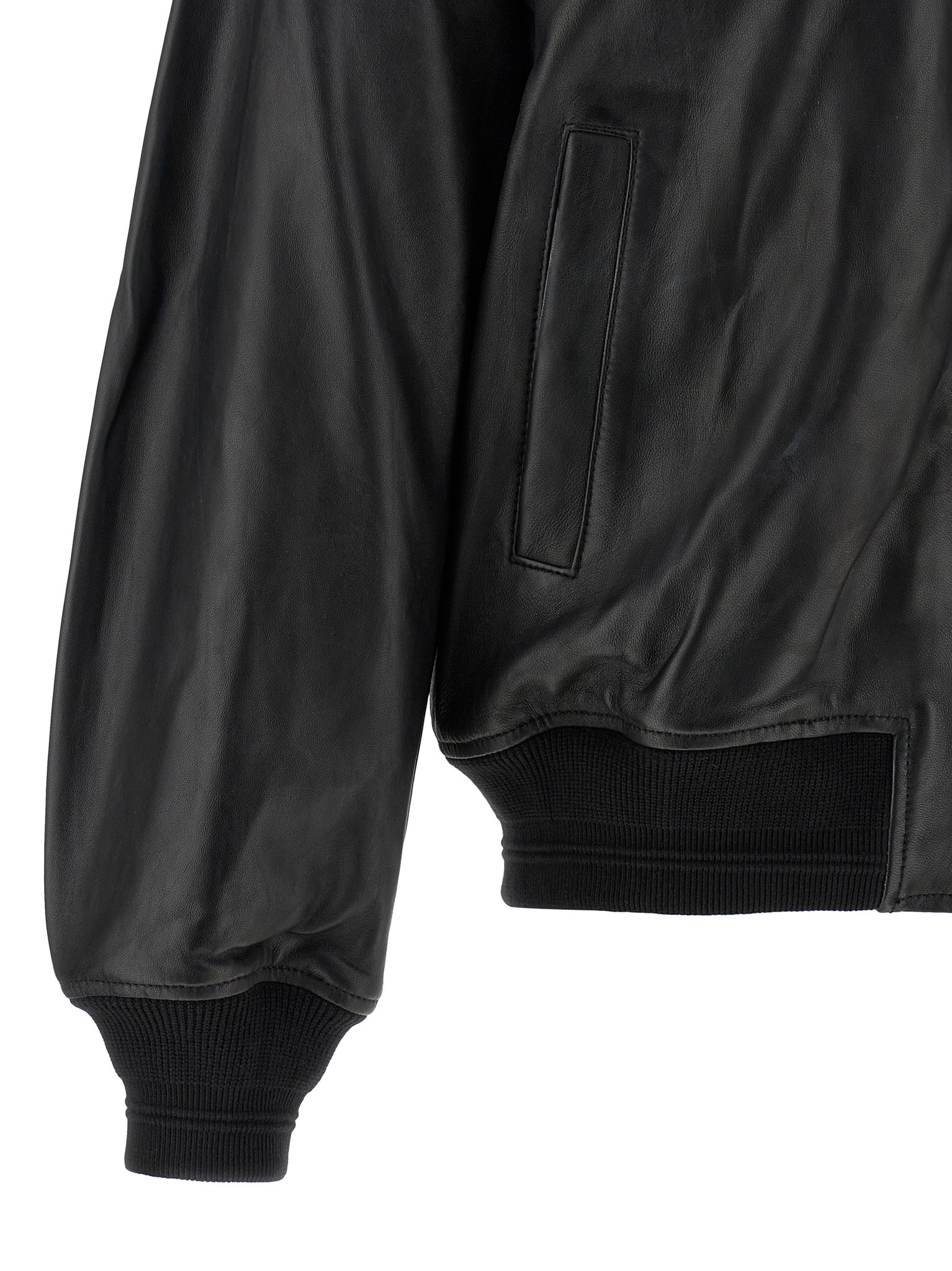 L-type' leather bomber jacket with ribbed stretch knit details, Embossed 'oval d' logo and front zip closure, High neck, Pockets, Long sleeves with cuffs and dropped shoulders, Headband, Monogram cotton lining. Size and Fit - Comfort fitMade in: India