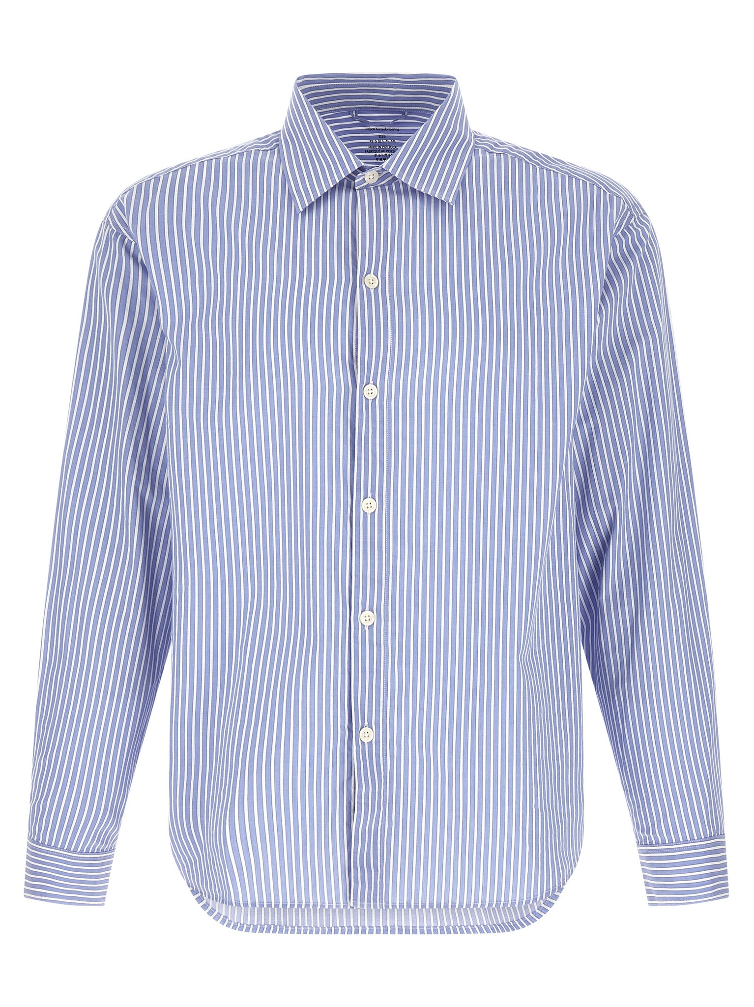 'generous' shirt in cotton poplin washed in a patterned striped garment, Italian collar, Front mother-of-pearl button closure, Long sleeves with cuffs and dropped shoulder, Back rack with cannon pleats, Rounded hem. Size and Fit - Relaxed fitMade in: Portugal
