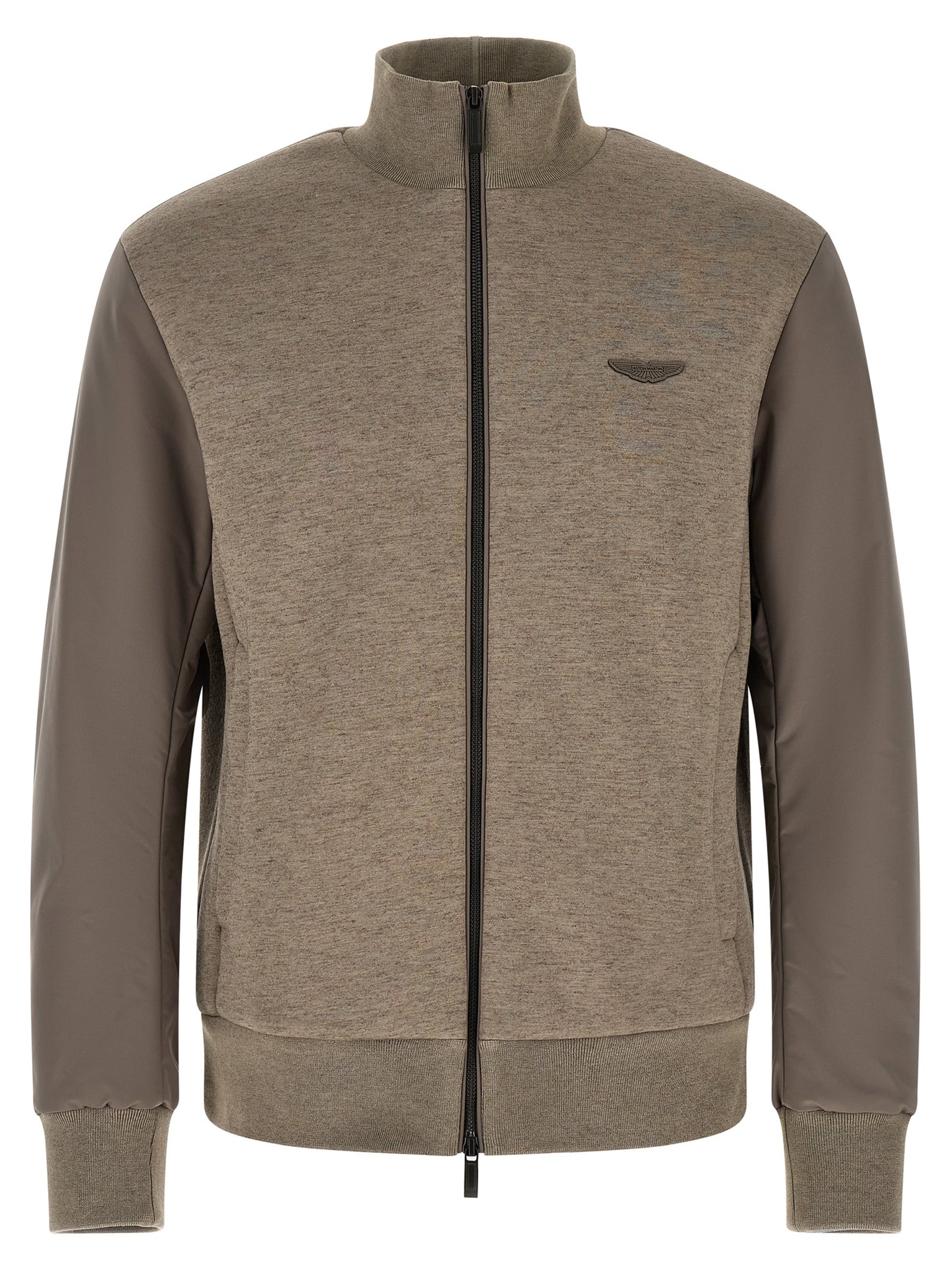 Boss x aston martin 'shepherd 242' bomber jacket in viscose and wool blend mélange with tone-on-tone nylon sleeves and stretch ribbed knit details, Slightly padded nylon lining, Logo patch and front zip closure, High neck, Pockets, Long cuffed sleeves, And headband. Size and Fit - true to size fit