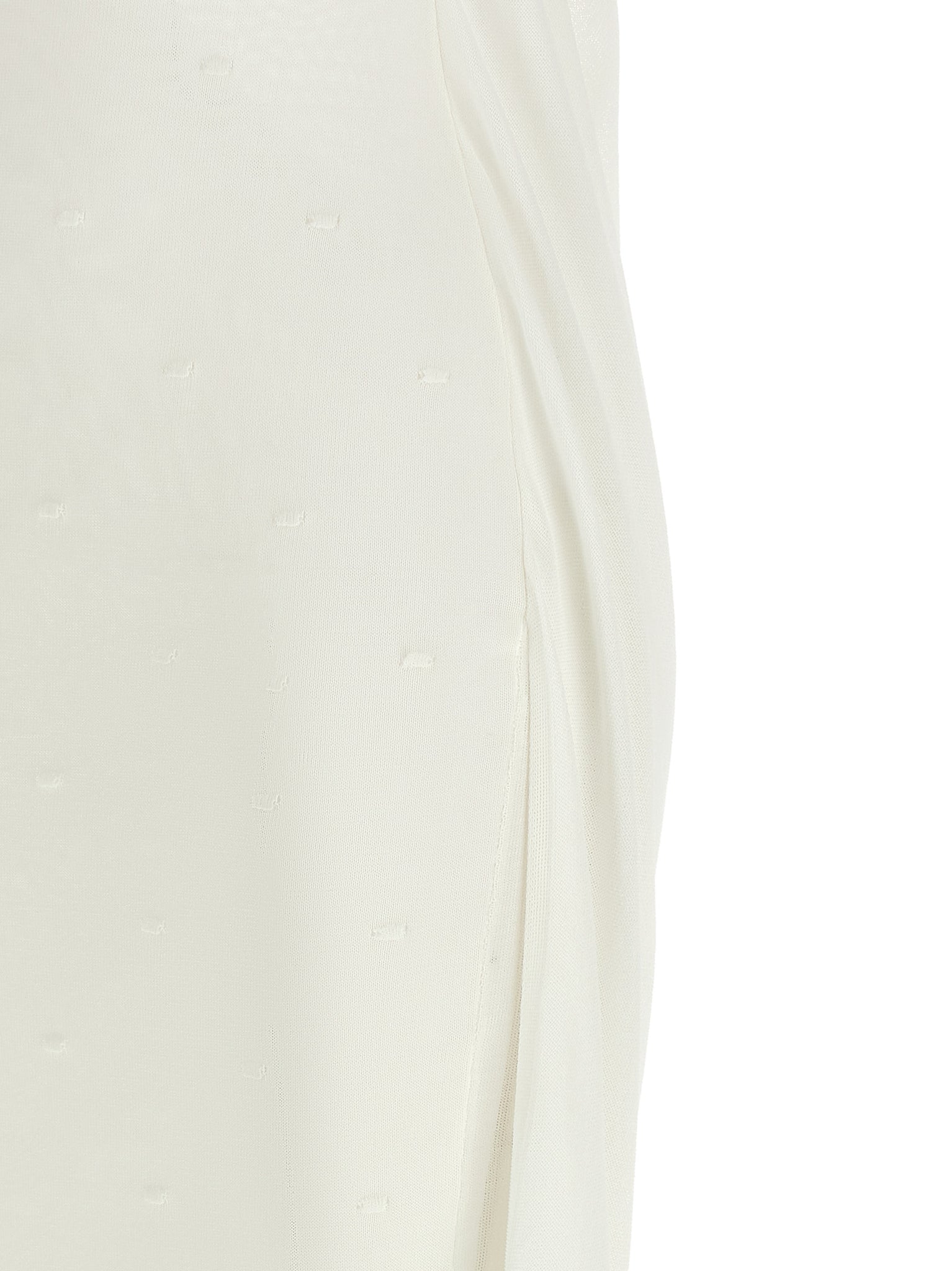 The Jacquemus La Robe Maille Plumetis Dress is a semi‑transparent long dress in white jersey with a structured polka dot front and full lining that balances coverage with lightness. Its slim, straight silhouette and thin straps frame a square neckline while a wide draped hood-like back insert extends to the hem for elegant movement. Designed for an adult female fit in French sizing, the piece offers a sculpted look without restricting wearability.