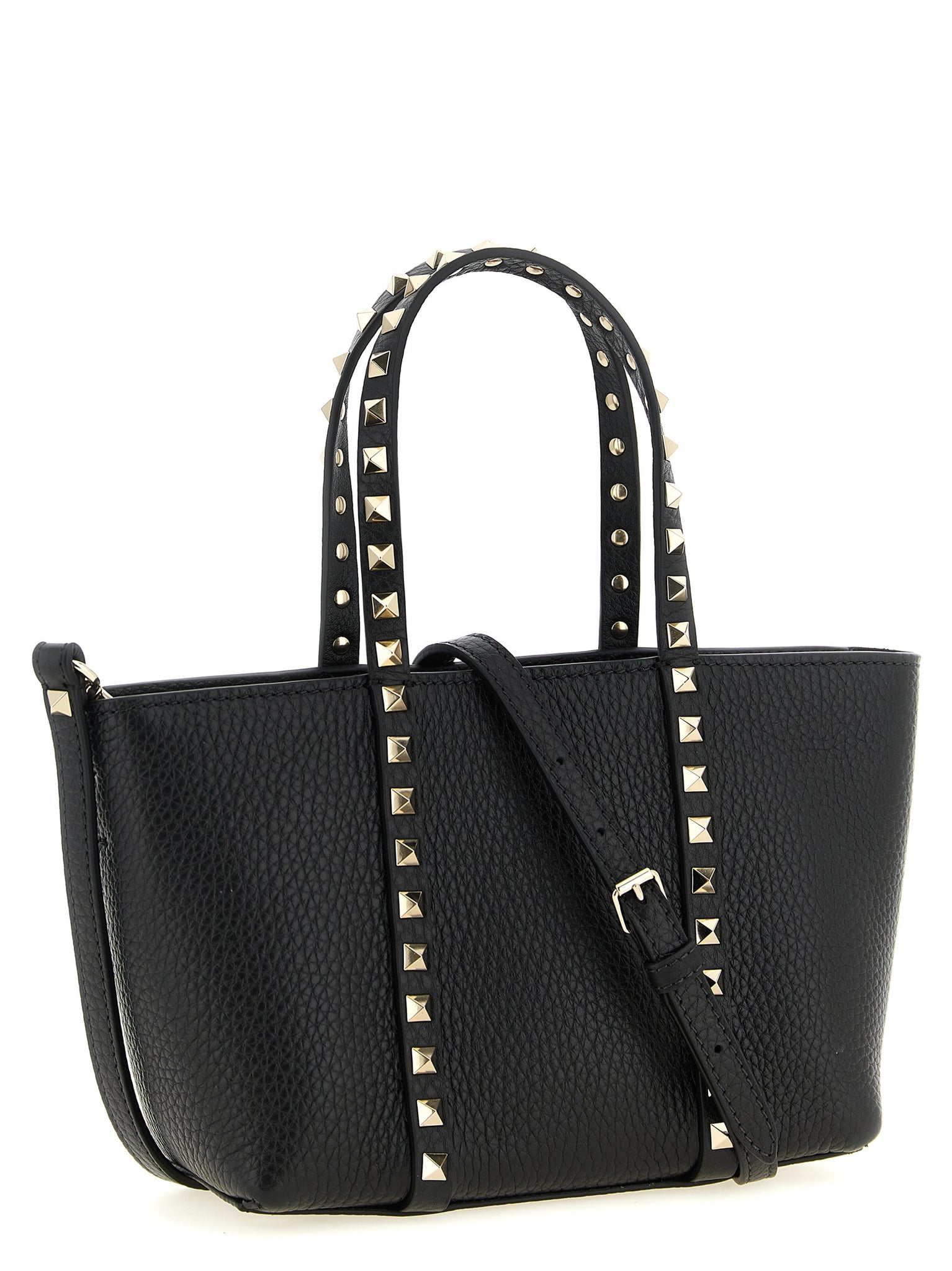 'rockstud' mini hammered leather shopping bag with metal stud application, Double fixed handle, Upper inner zip closure, Rigid base with metal feet, Nappa lining, Adjustable and removable shoulder strap. Size and Fit - W 20 x h 16 x d 8.5 cmMade in: Italy