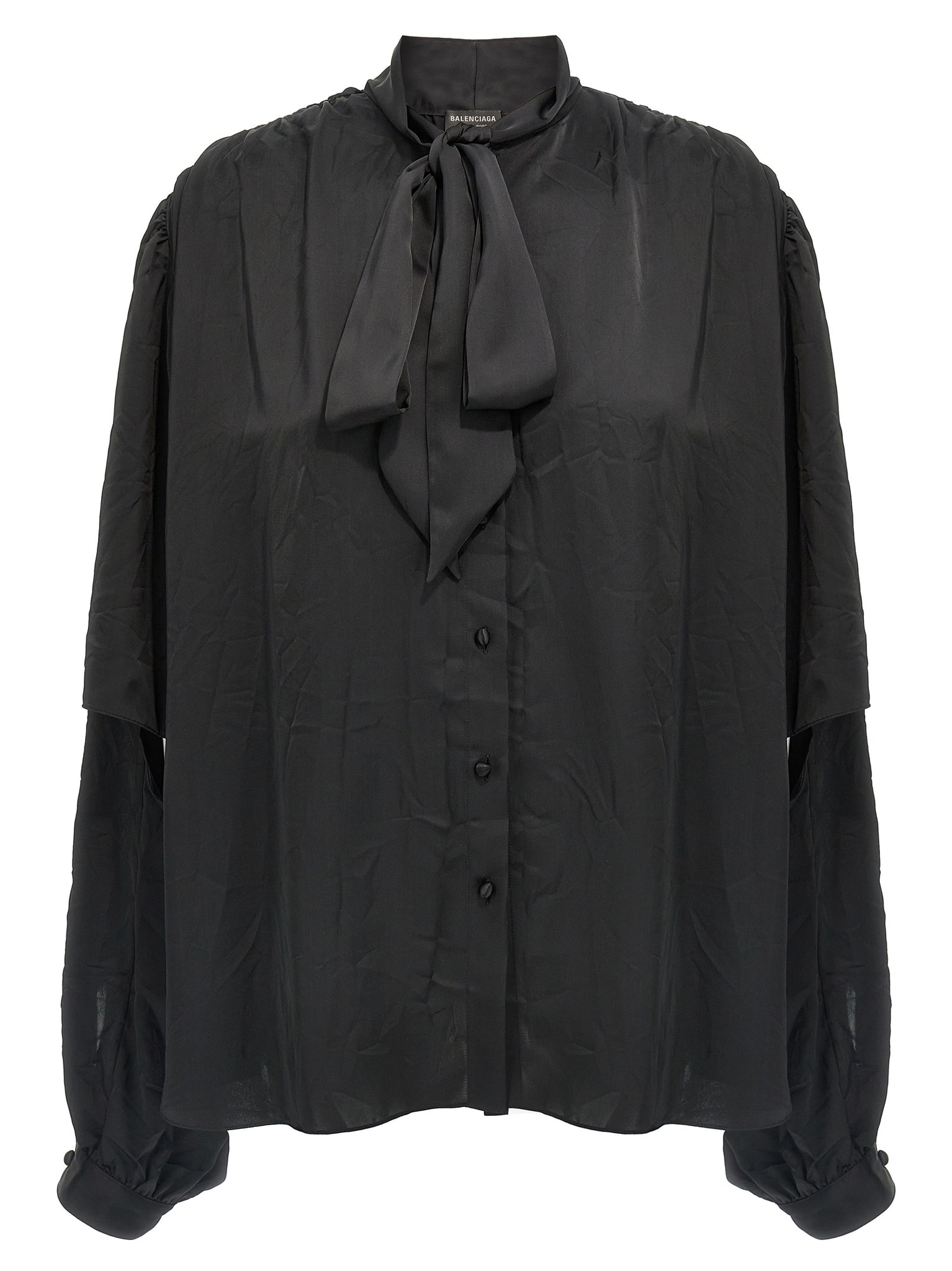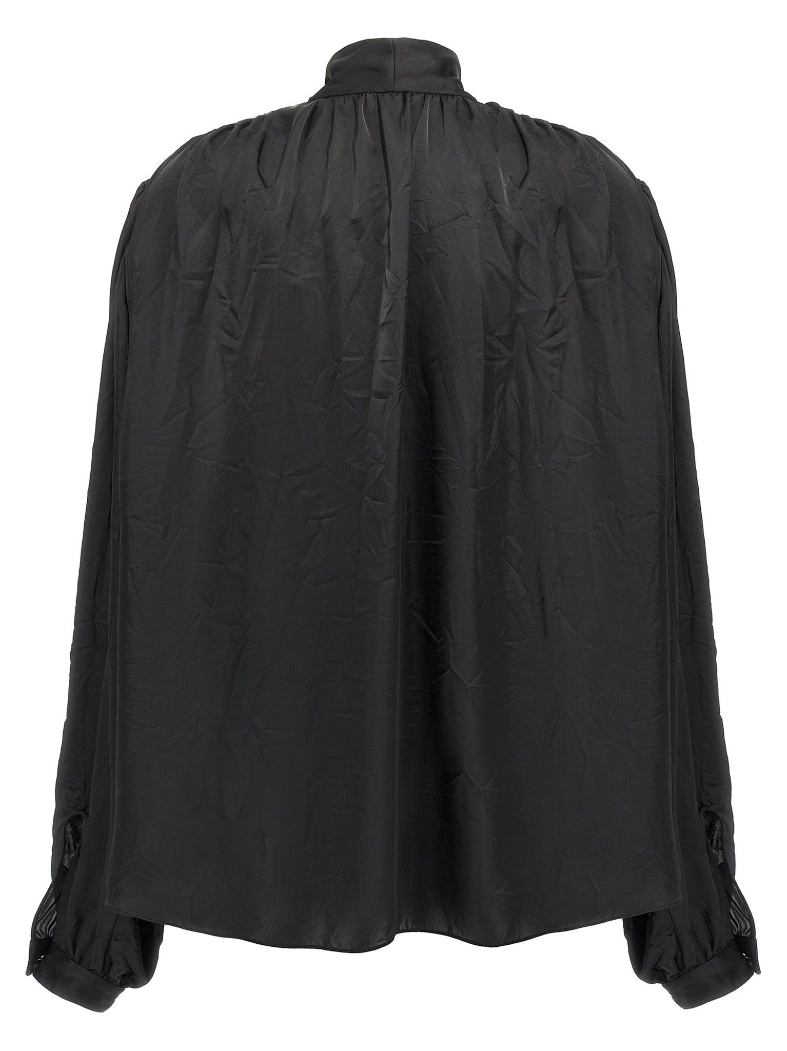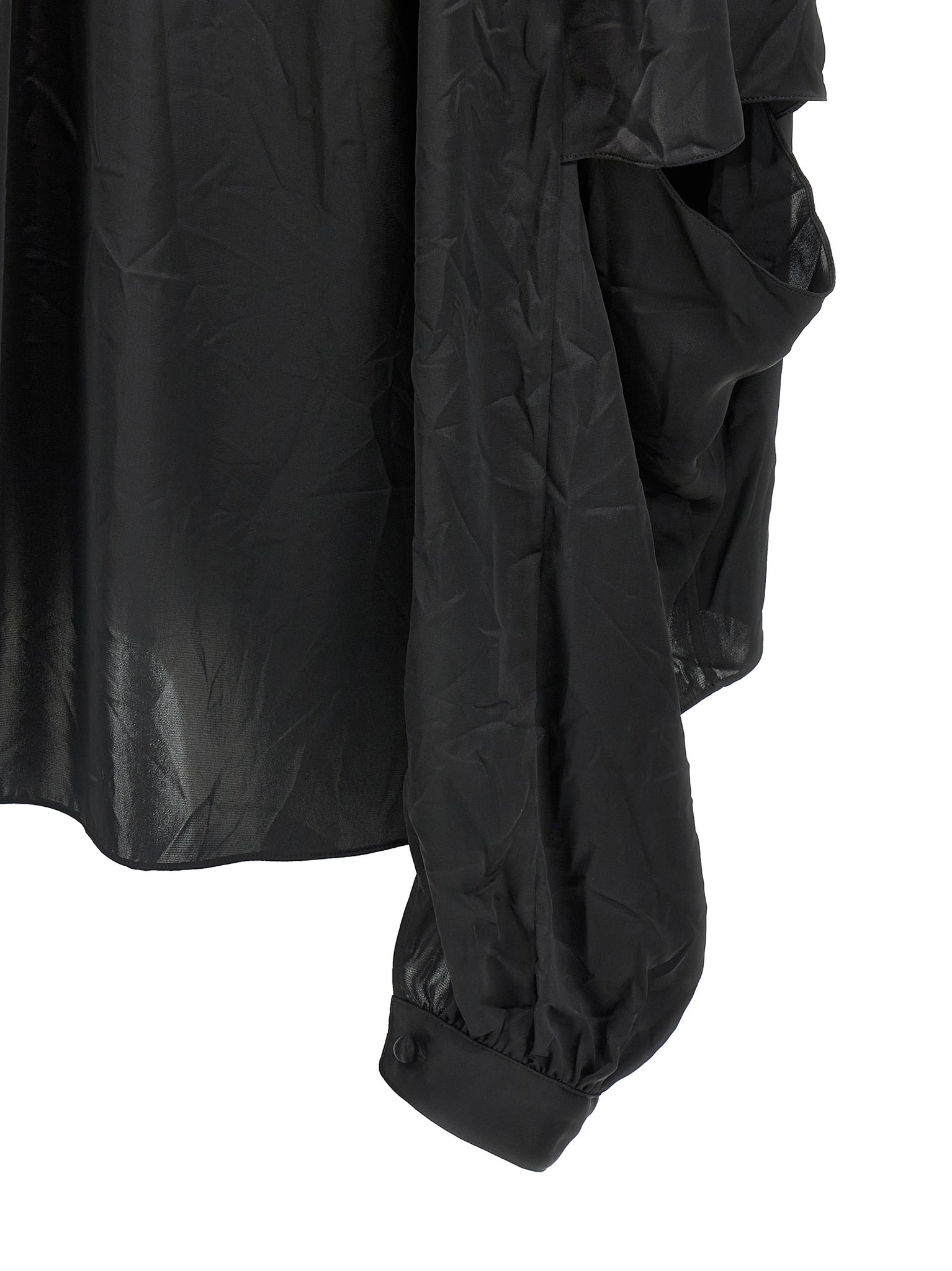 'double sleeve' technical crêpe shirt with lavallière collar, Front button closure, Long sleeves with dropped shoulder cuffs and elbow height cut-out. Size and Fit - oversized fit FRENCH SIZE