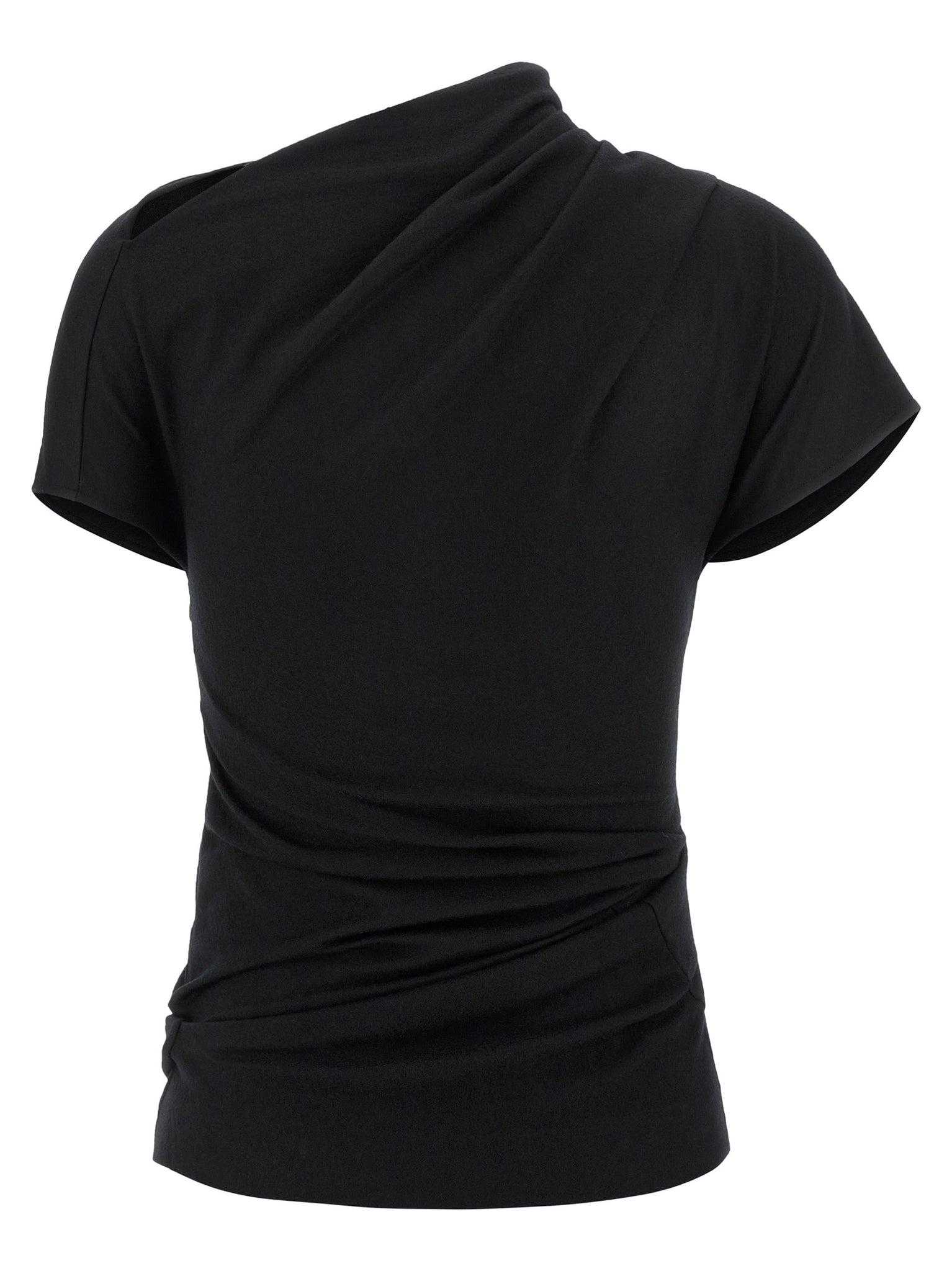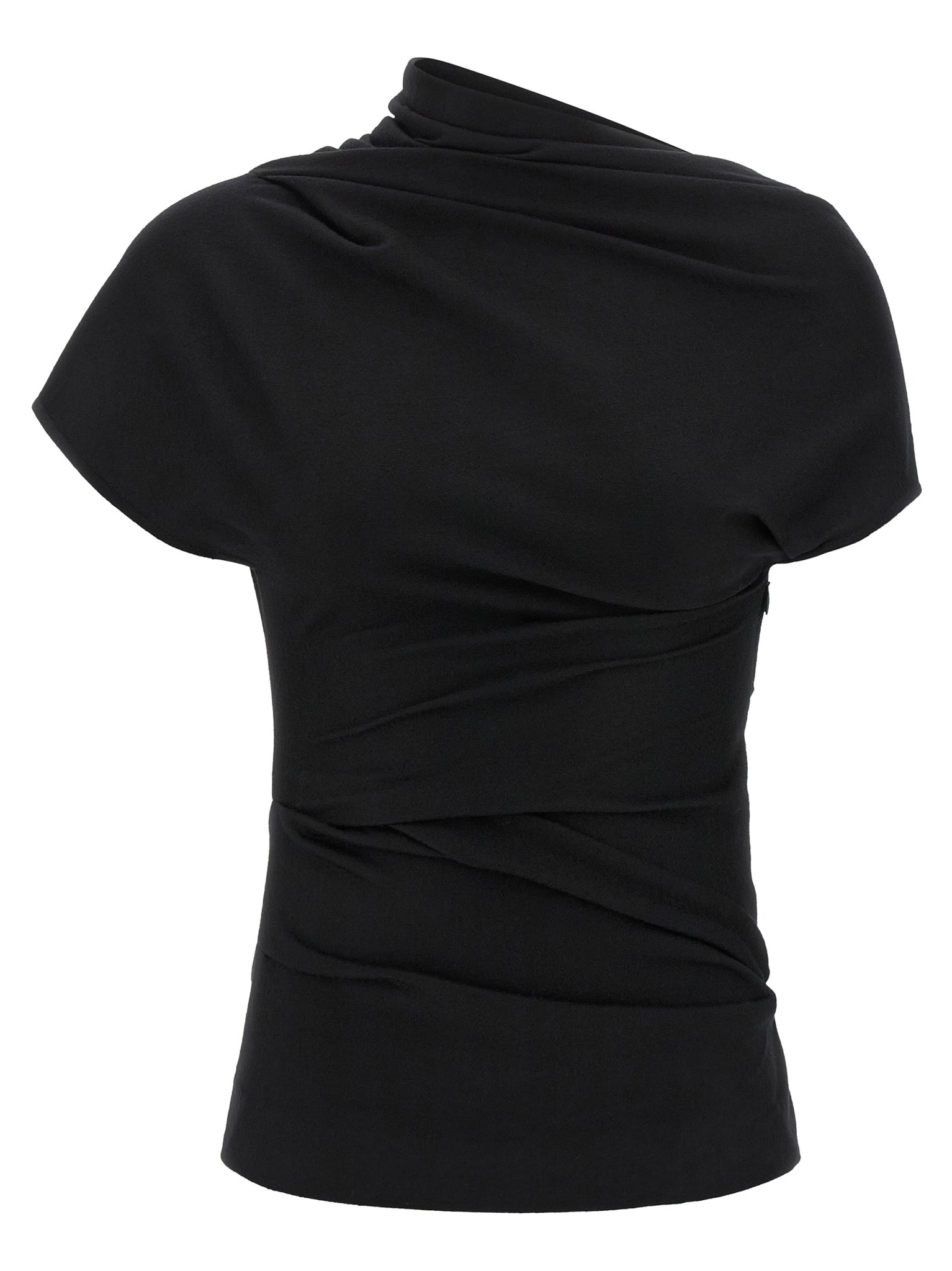 'flop' stretch wool top with boat neckline with front and back draping, Short sleeves, Side zip closure. Size and Fit - Slim fit