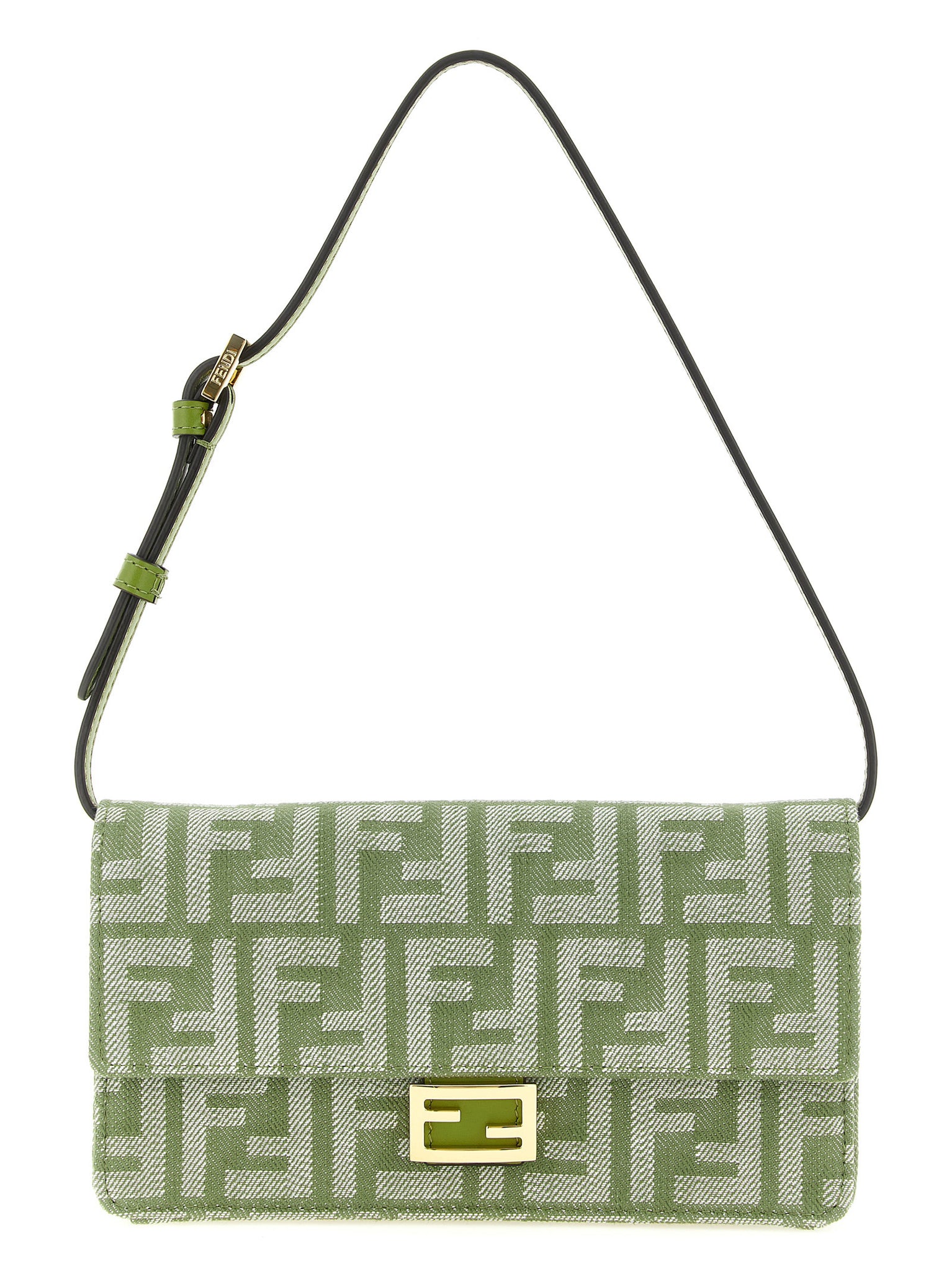 'baguette' wallet on chain in denim-effect ff jacquard, Flap closure with snap button and front metal ff logo, Leather lining, Adjustable and removable leather handle, Removable chain shoulder strap.Made in: Italy