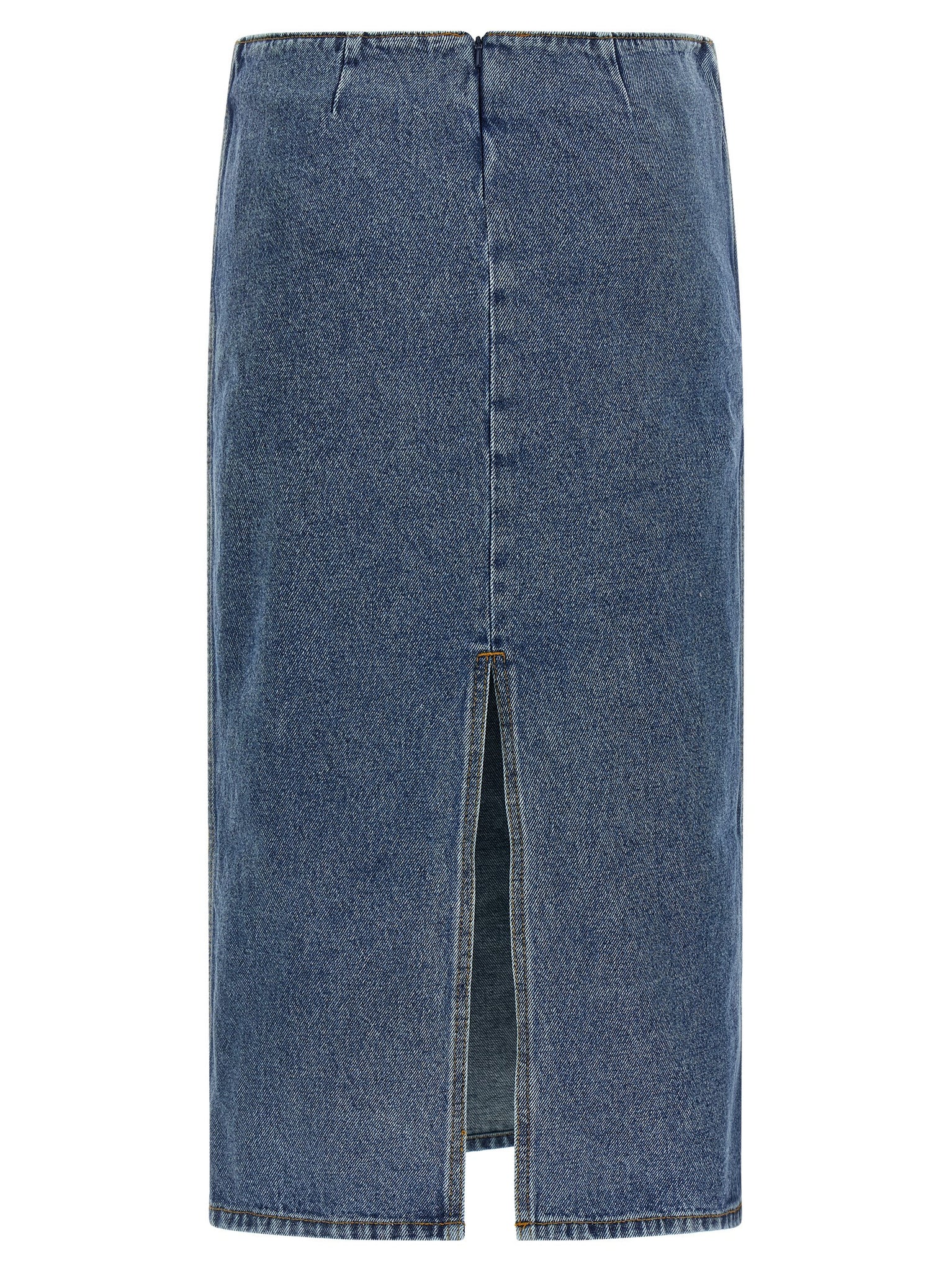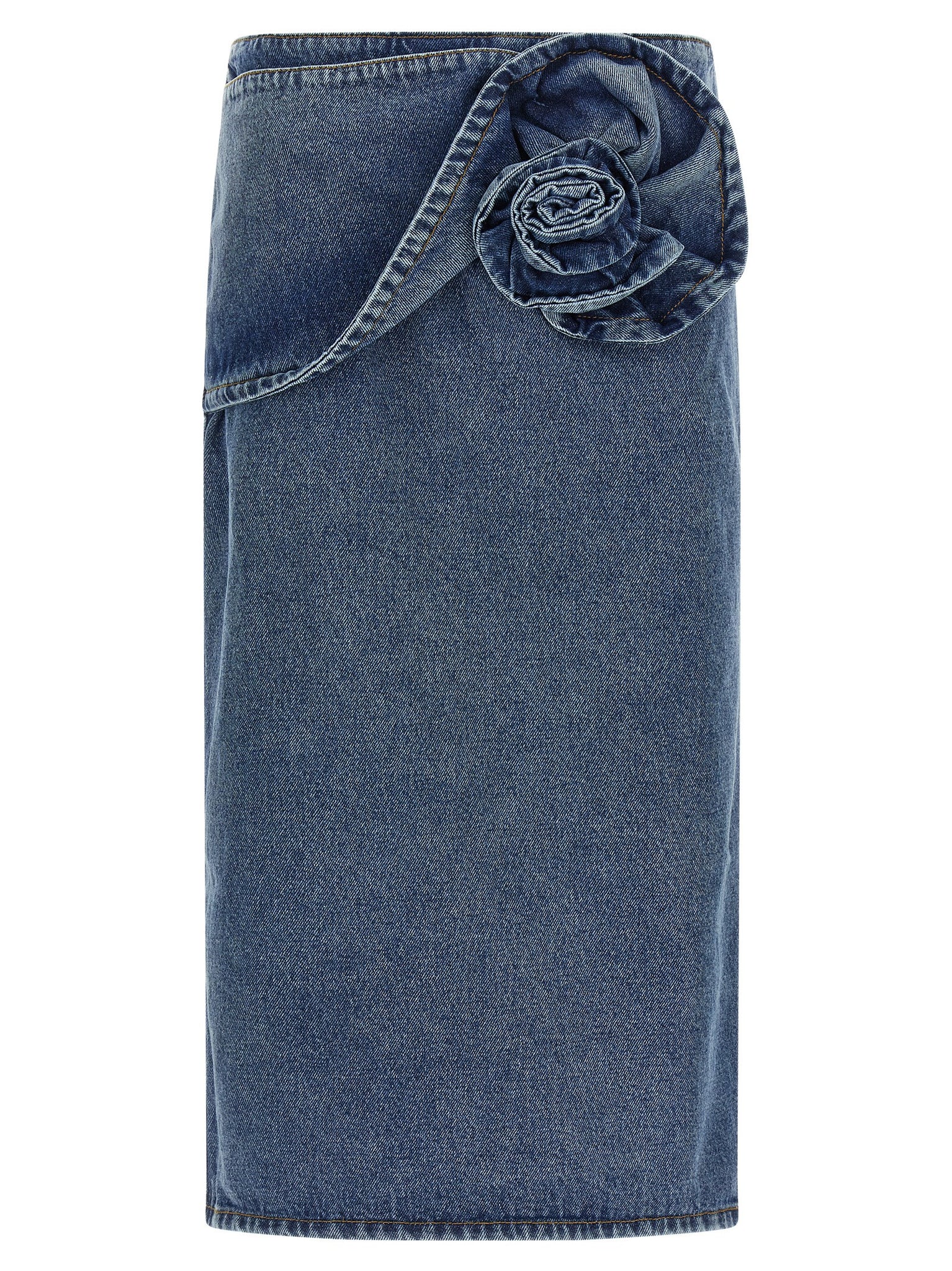 '11' midi skirt in cotton denim with contrast stitching, Large 3d floral decoration on the front, Longuette model, Zip closure and back split. Size and Fit - true to size fit - FRENCH size