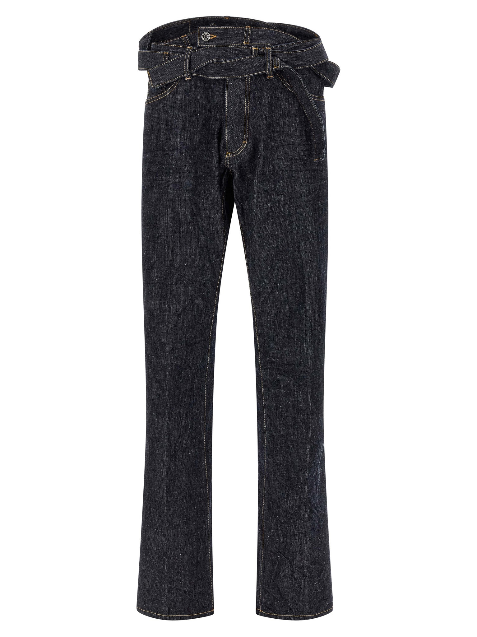 Magliano x dsquared2 capsule 'butch' jeans in garment-dyed cotton denim with wrinkled effect, Contrast stitching, Straight leg, Front button closure with strap detail to pass around the belt, Five pockets, Back logo tag. Size and Fit - true to size fit