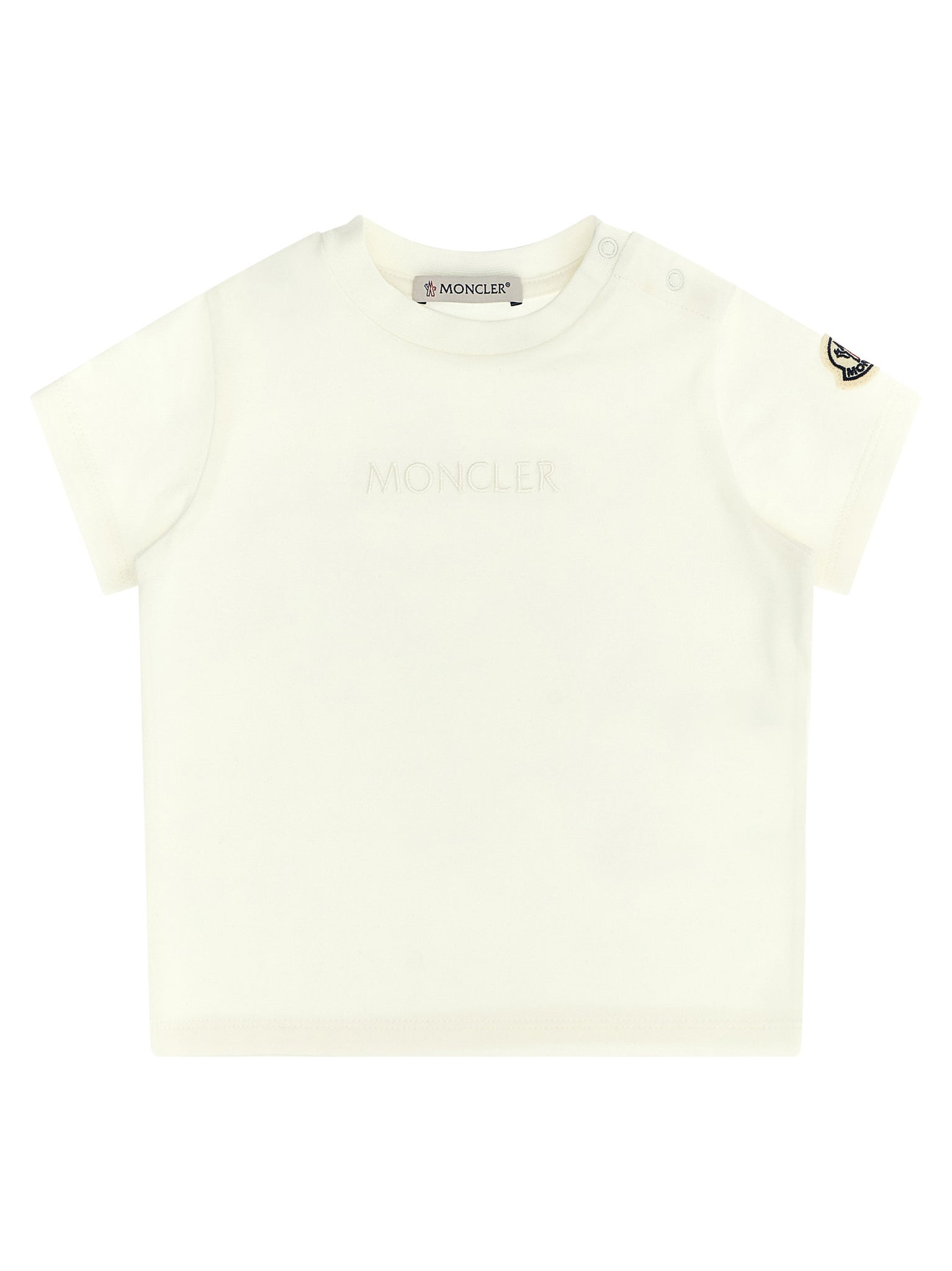 Kids cotton jersey t-shirt with tone-on-tone logo embroidery on the front, Crew neck, Snap buttons on the left shoulder, Short sleeves with felt logo patch appliqué. Size and Fit - True to size fit