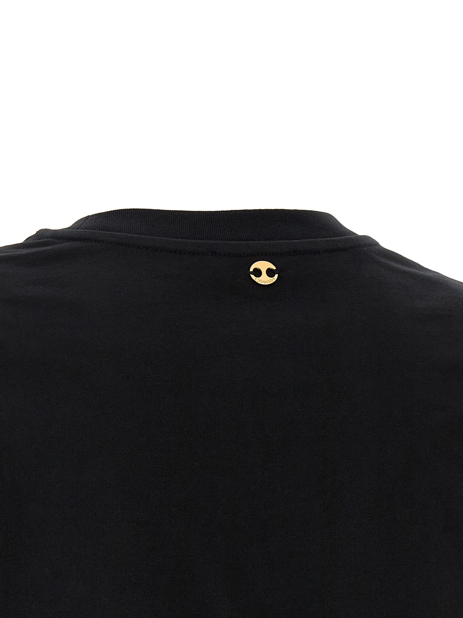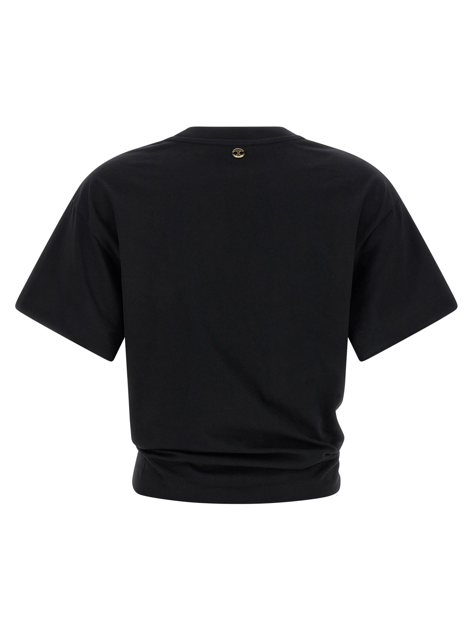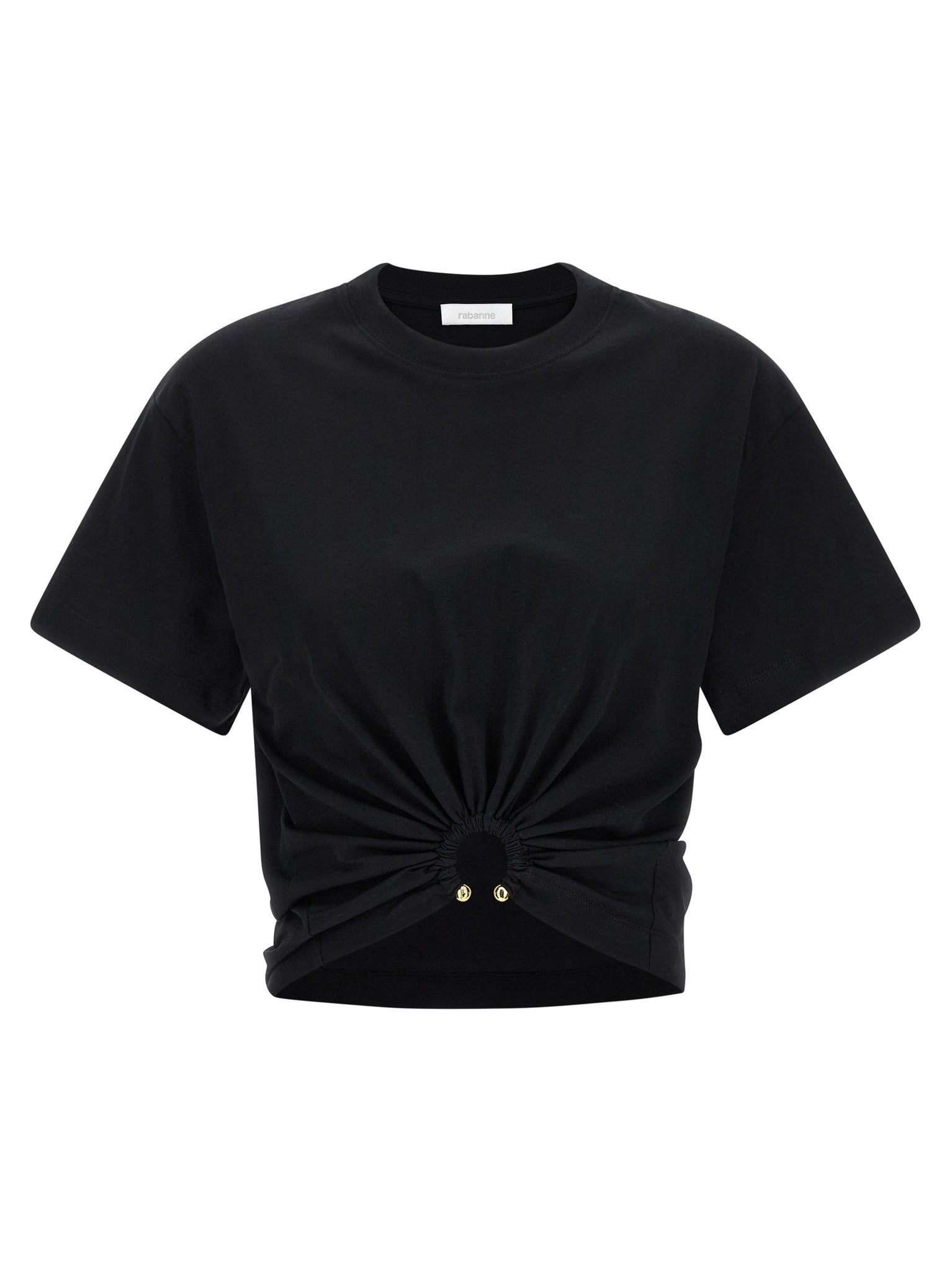 Cotton t-shirt, Front metal piercing that creates drapes, Crop model, Crew neck, Short sleeves, Asymmetrical hem. Size and Fit - true to size fit