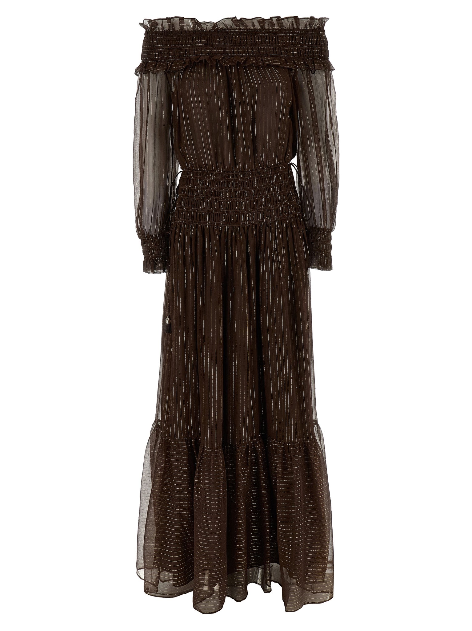 'brown georgette off shoulder maxi' dress in crinkled georgette with lamé threads, Off-the-shoulder model with ruffles and upper smock stitch, At the waist and cuffs, Flounces on the hem, Long sleeves with cuffs, Drawstring at the waist.