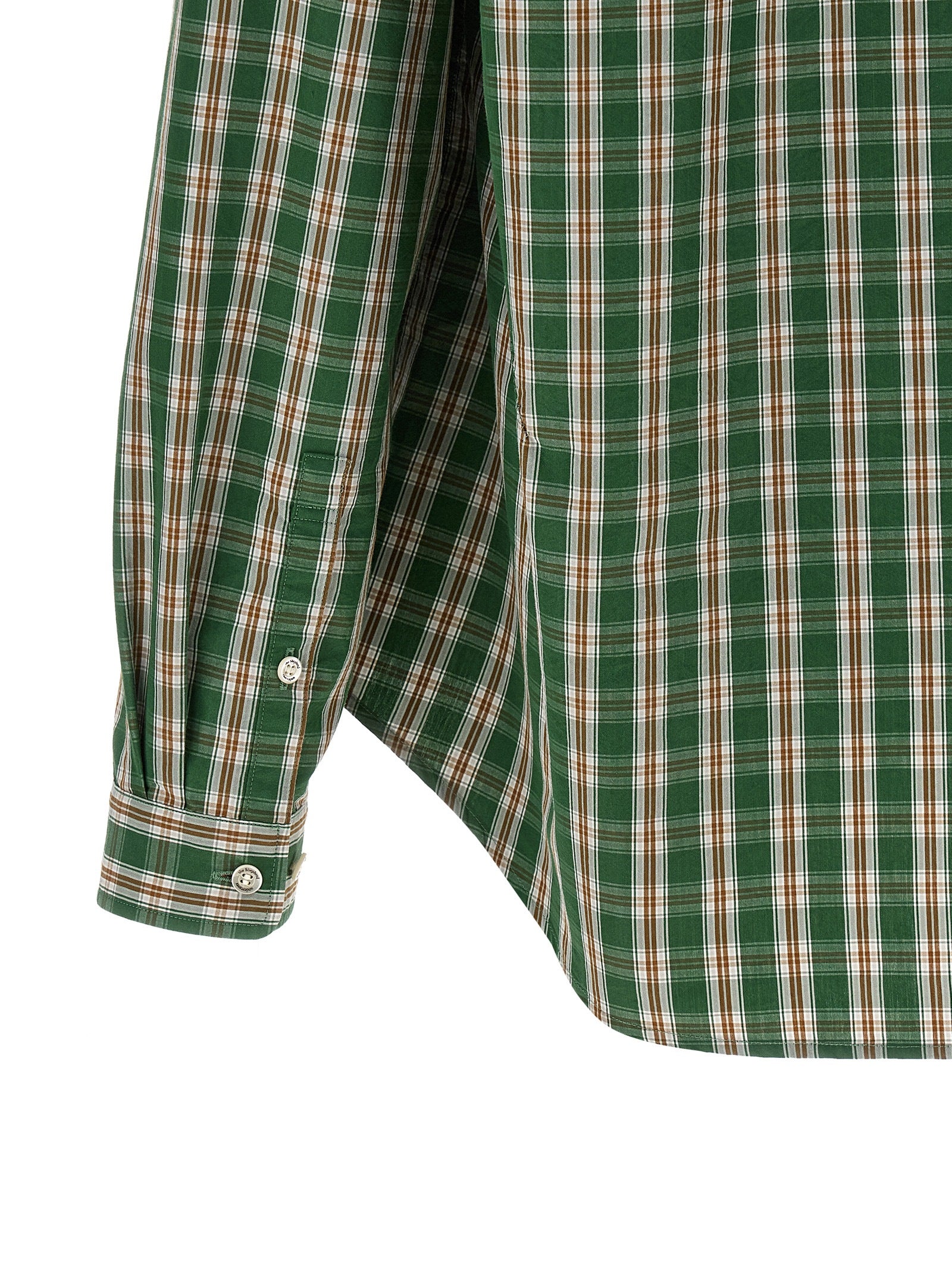The Shepherd Undercover shirt in green is a Tangzhuang-style cotton top that balances a relaxed, true-to-size fit with refined tailoring details. It features a mandarin collar, asymmetrical pankou front closure, patch and side pockets with logo button, long sleeves with adjustable cuffs and a dropped shoulder, plus a rounded, uneven hem for subtle movement. The fabric shows a wrinkled all-over check print for textured visual interest while remaining easy to wear for daily layering. This piece suits an adult male wardrobe seeking structured casualwear with thoughtful design touches.