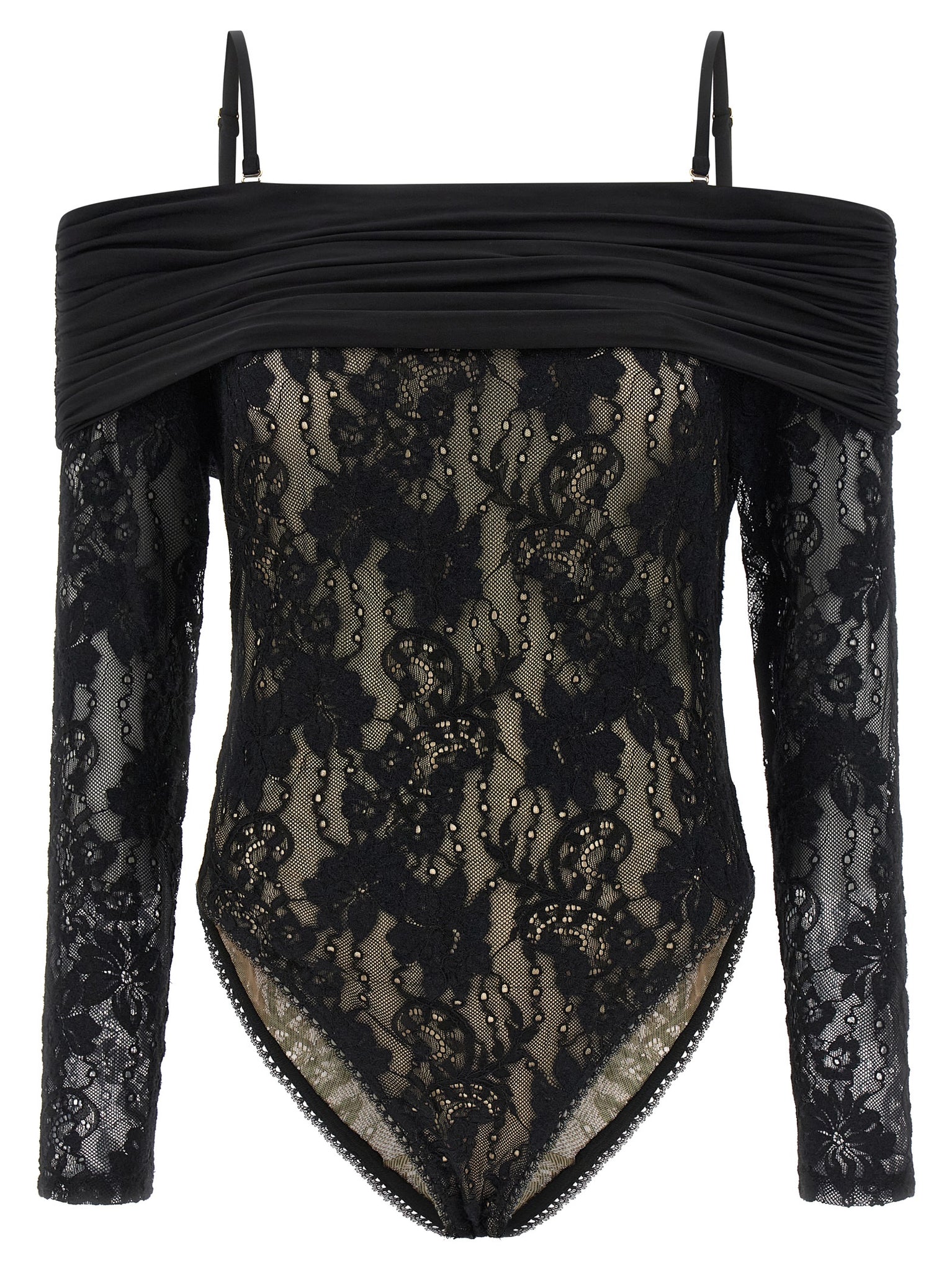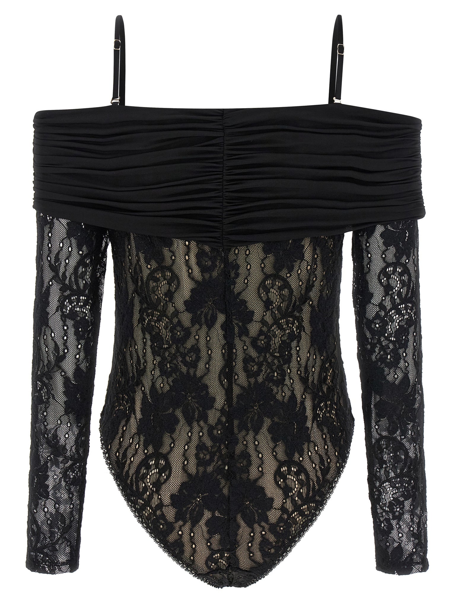 'rebellion' stretch lace bodysuit with mesh lining, Off-the-shoulder style with curled insert on the shoulders and draped cover, Thin adjustable and removable straps, Long sleeves, Snap button closure on the hem. Twisted romance collection. Size and Fit - true to size fit