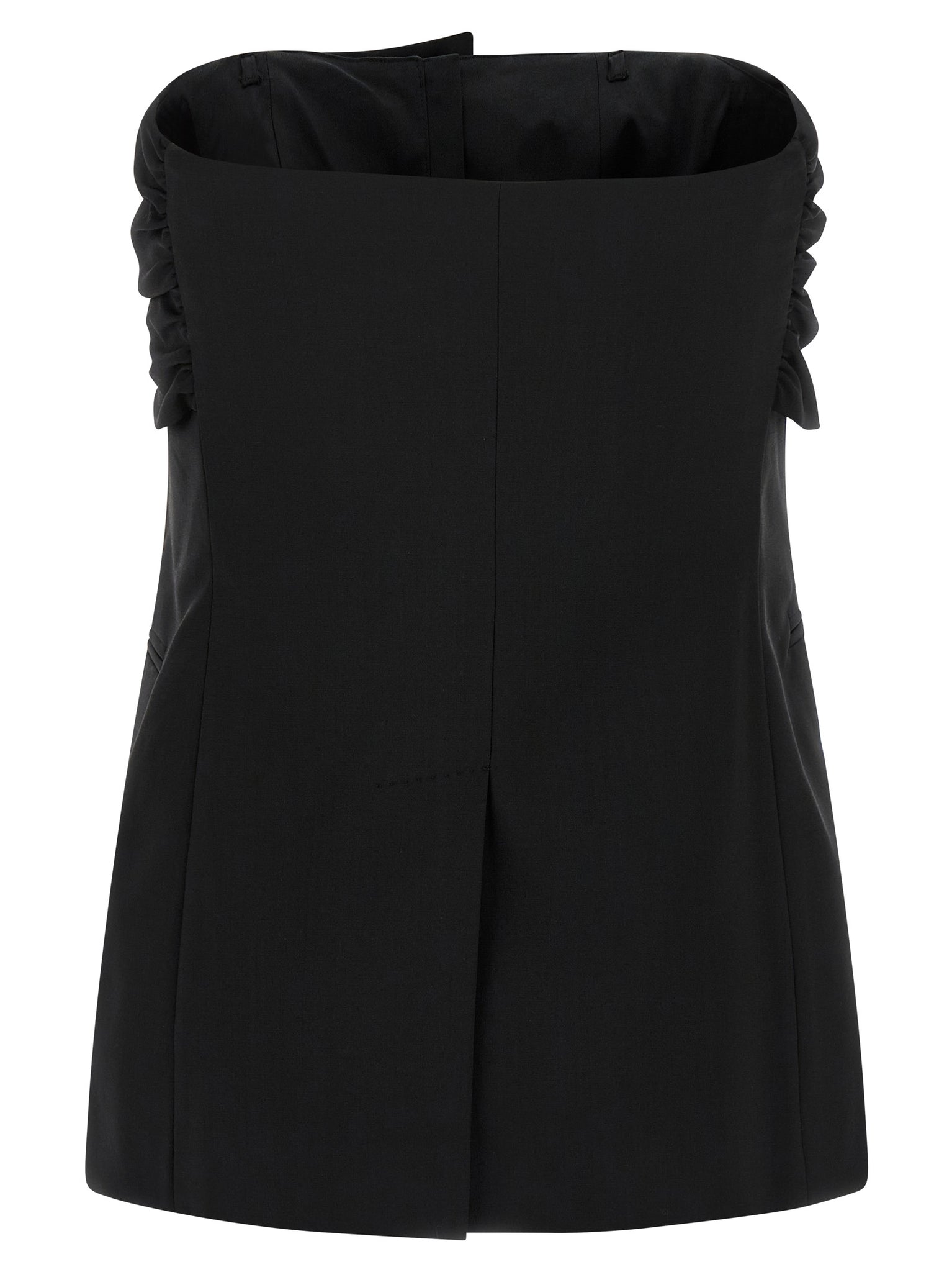 'veruska' sleeve top in light pure wool canvas with inner bodice with splints, Off-the-shoulder style with couture bow pattern knotted on the front, Thin removable straps, Button closure, Pockets, Zip and back split closure, Lining. Size and Fit - Slim fit