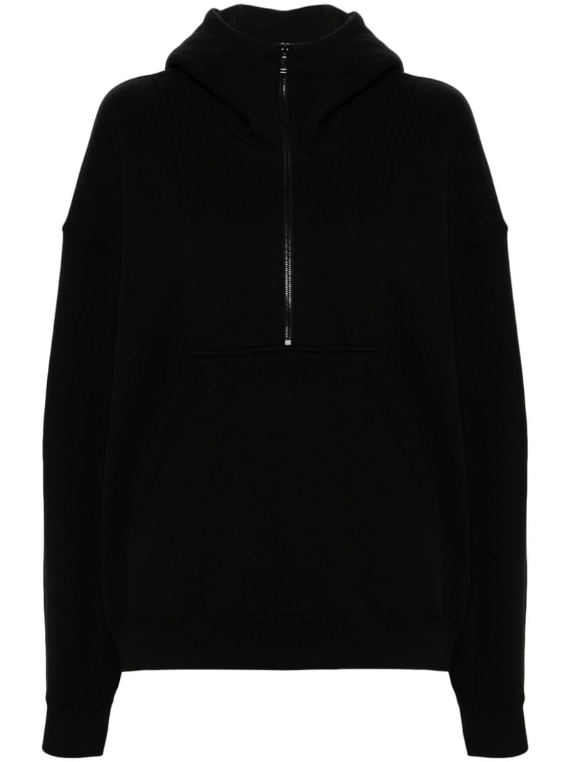 black cotton jersey texture embroidered logo classic hood half front zip fastening drop shoulder long sleeves ribbed cuffs and hem front pouch pocket straight hem fleece lining We've partnered with Good On You — an independent agency that rates how brands perform in relation to their impact on the planet, people and animals, with a multi-criteria rating simplified to a five points scale. In order to be awarded our conscious label, larger brands need to score a minimum of four out of five ('Good'), while smaller brands must score at least three out of five ('It's A Start'). This item comes from a brand rated three out of five ('It's A Start') by Good on You at the time it was added on FARFETCH. Please note, this is a brand-level rating and does not guarantee that this product is made with conscious materials. Learn more about what makes a product Conscious on our Conscious Criteria page Size and Fit - This piece fits true to size. We recommend you get your regular size. Model is 1,75m / 5ft 8in wearing size SMade in: France