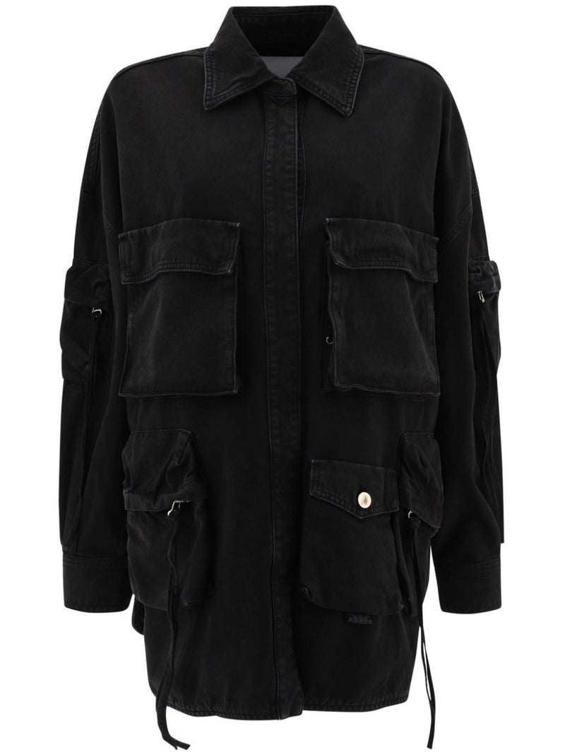 black cotton classic collar concealed front fastening long sleeves buttoned cuffs multiple cargo pockets curved hem Size and Fit - This piece fits true to size. We recommend you get your regular size. Model is 1,75m / 5ft 8in wearing size 40 (IT)