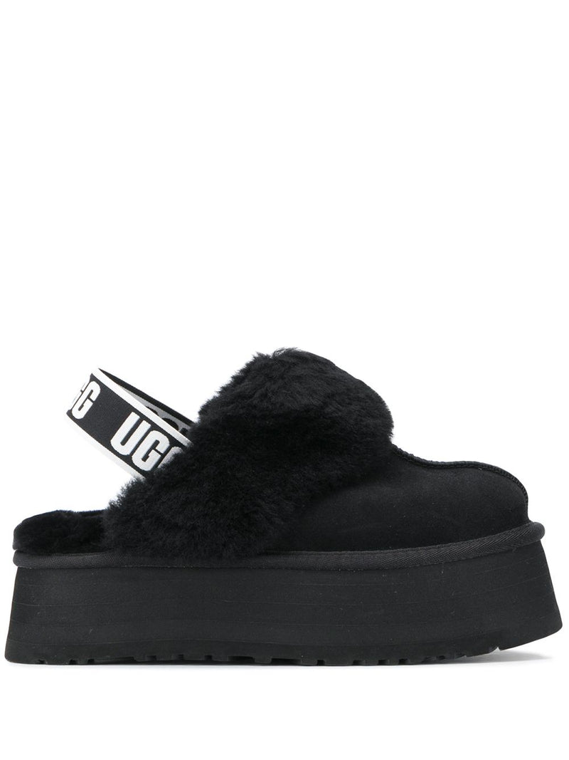 black leather round toe flatform sole faux fur detail logo slingback strap Funkette slippers